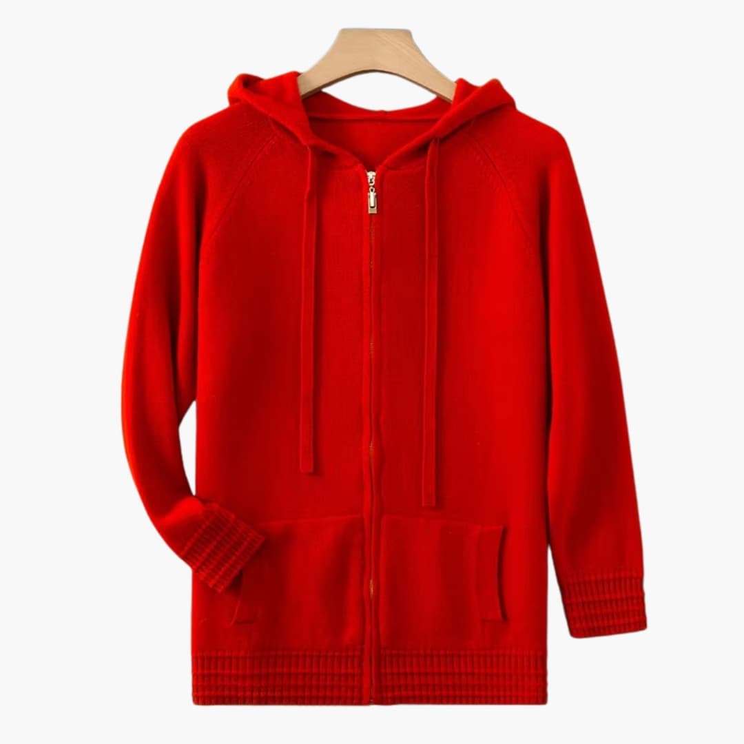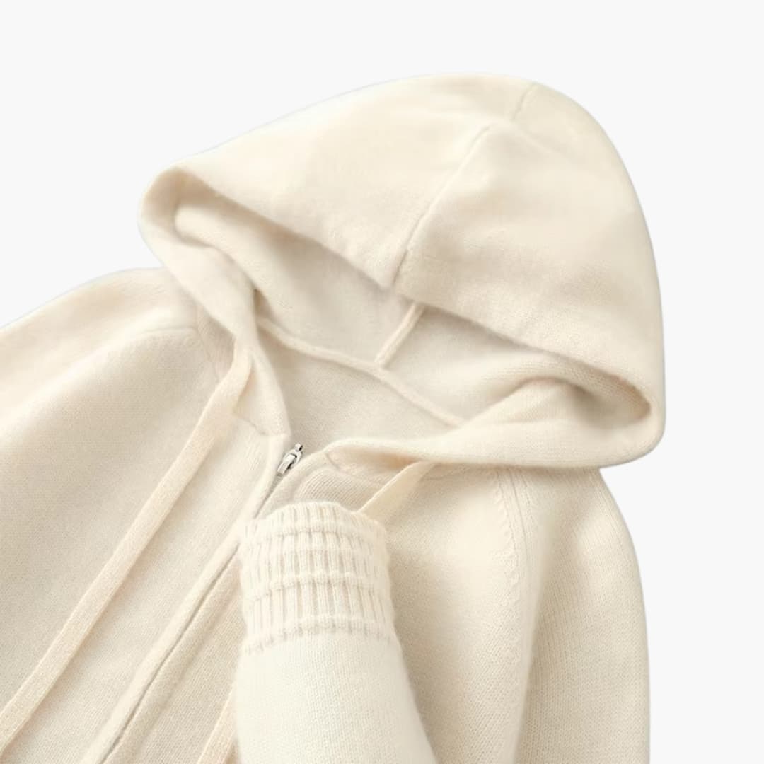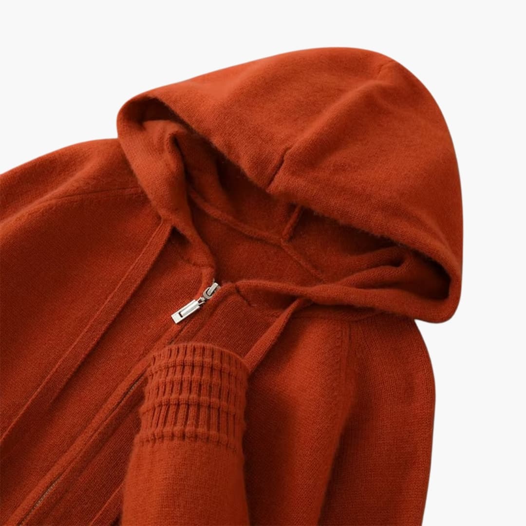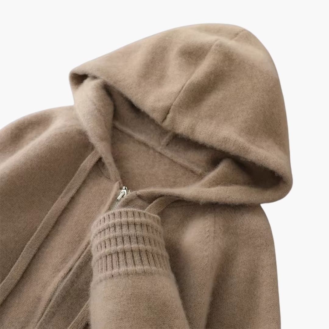 This men’s cardigan features a raised neckline with an attached hood and an open front layout. The design includes long sleeves, a straight hem, and no fastening elements. A plain knitted surface is present throughout, forming an upper garment intended for layering during cooler seasons.