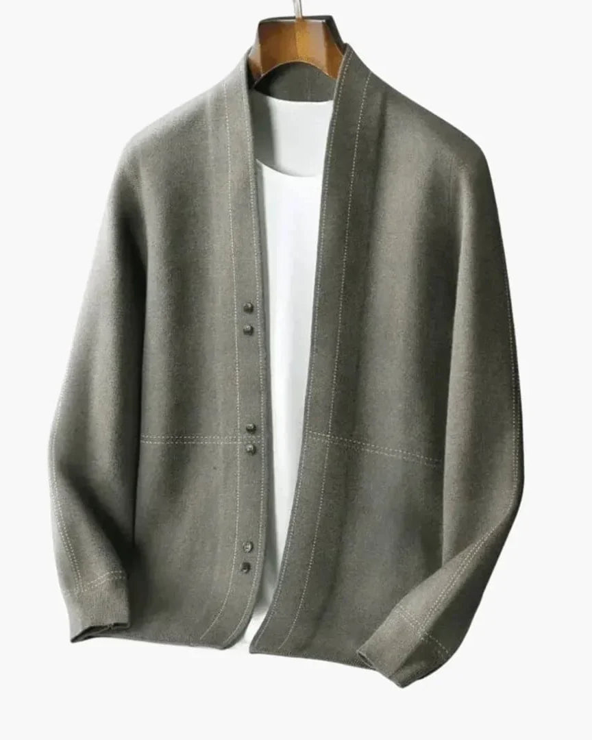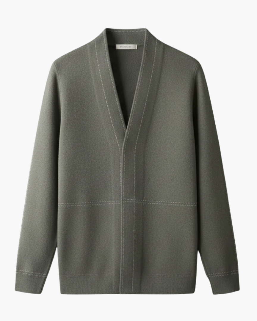This men’s hooded cardigan includes a drawstring hood and a full-length front zipper. It has two front pockets integrated into the lower panels. The long sleeves have ribbed cuffs, and the hem is ribbed as well. The outer surface features a textured knit pattern across the entire garment.