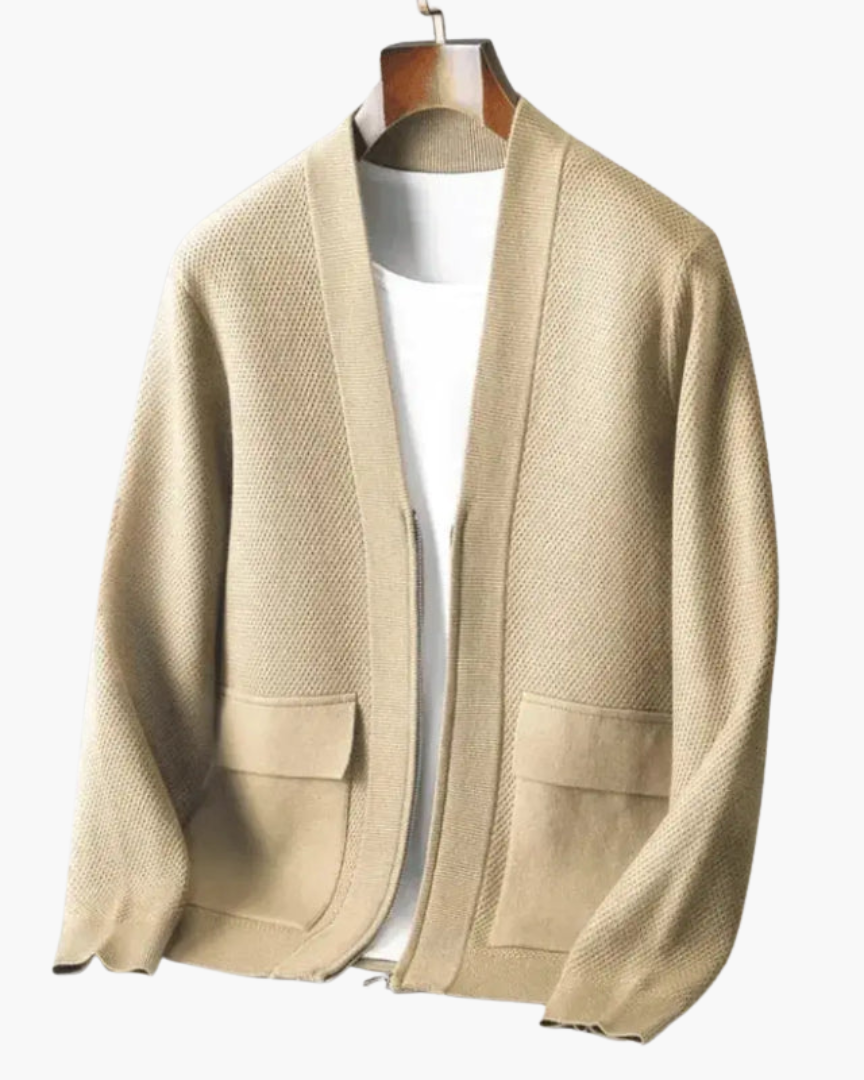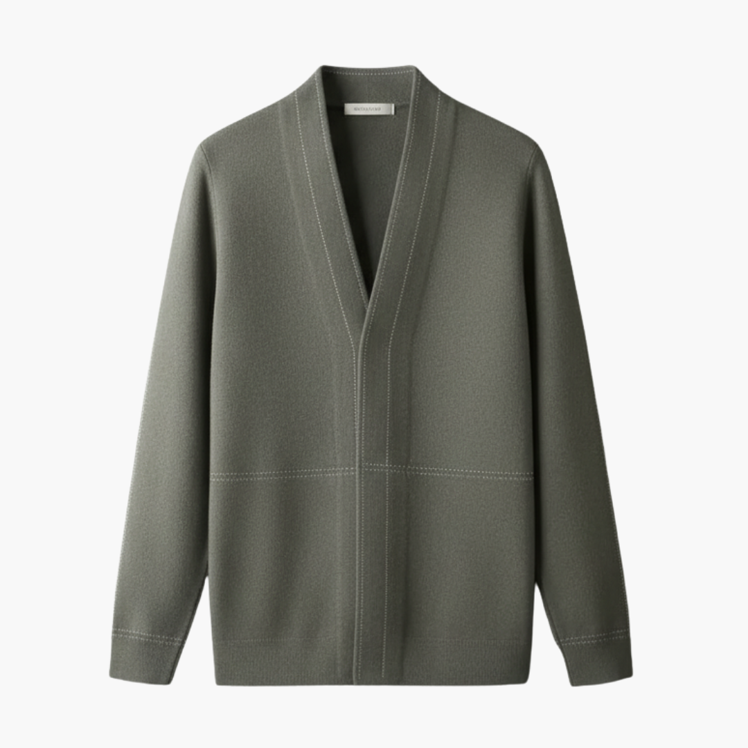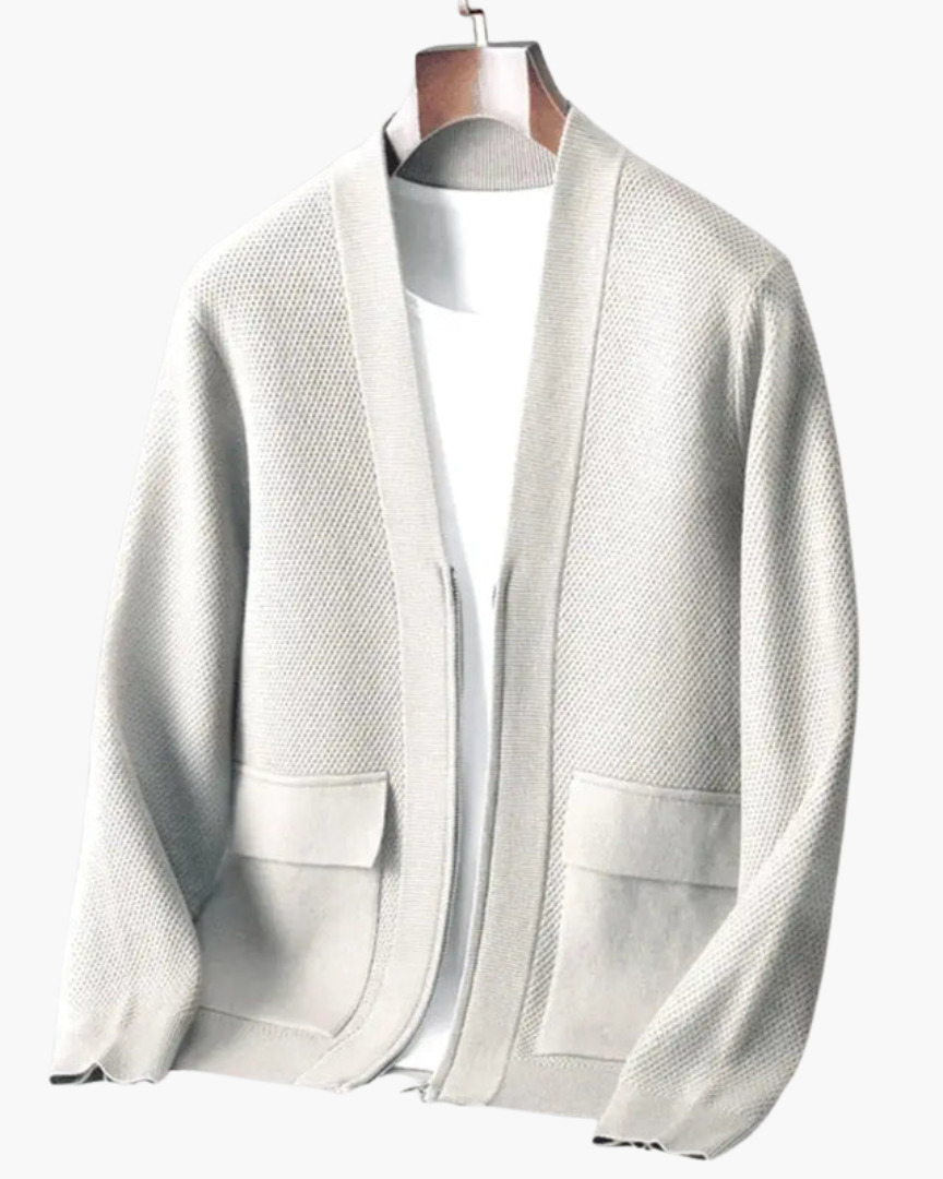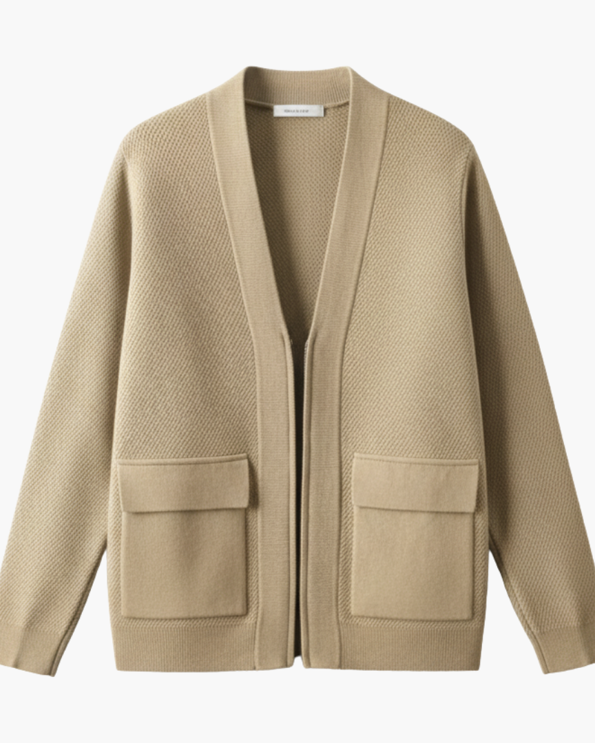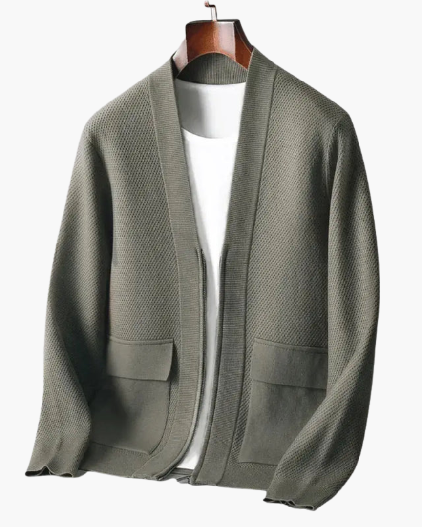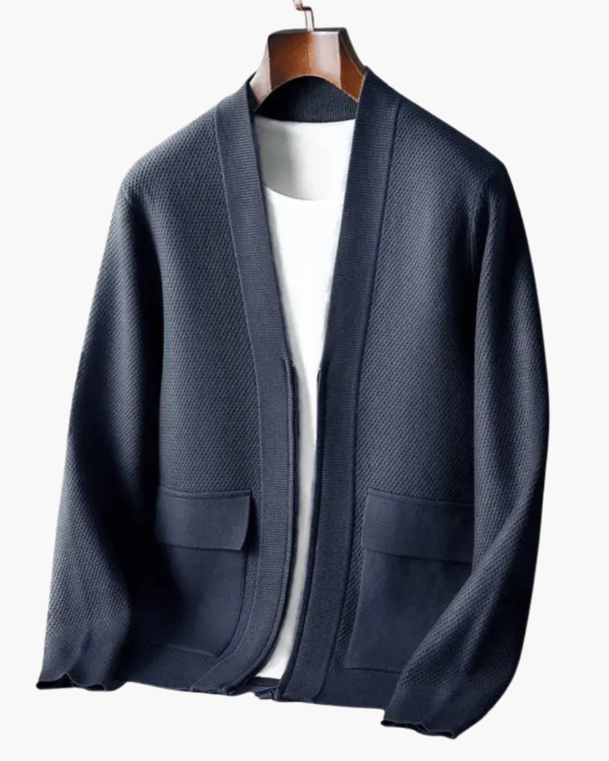 This men’s cardigan features an open-front design with a minimal button closure along the edge. The long sleeves include ribbed cuffs for a secure fit, while visible stitch lines define the silhouette. The outer layer presents a fine woven texture that provides a balanced layer ideal for transitional seasons.