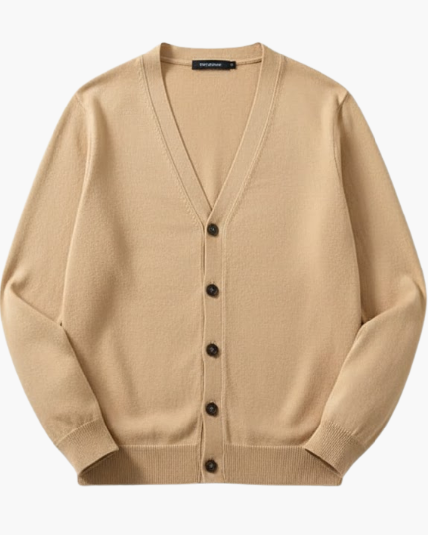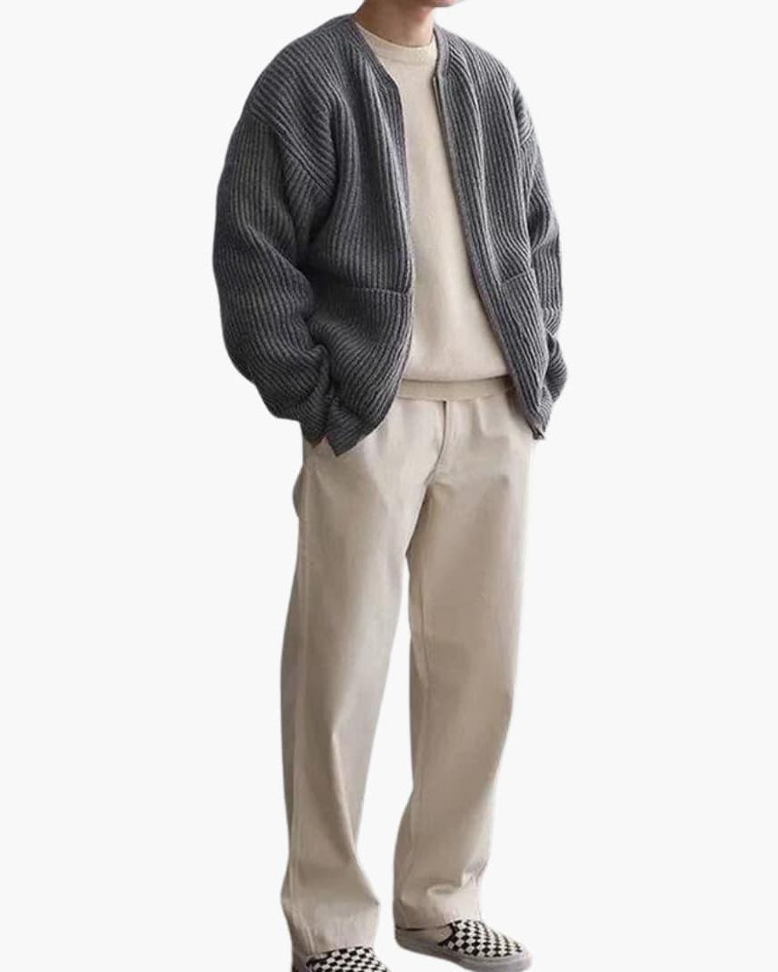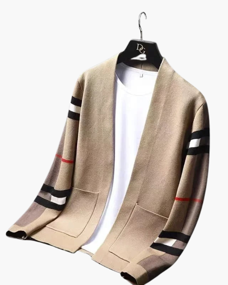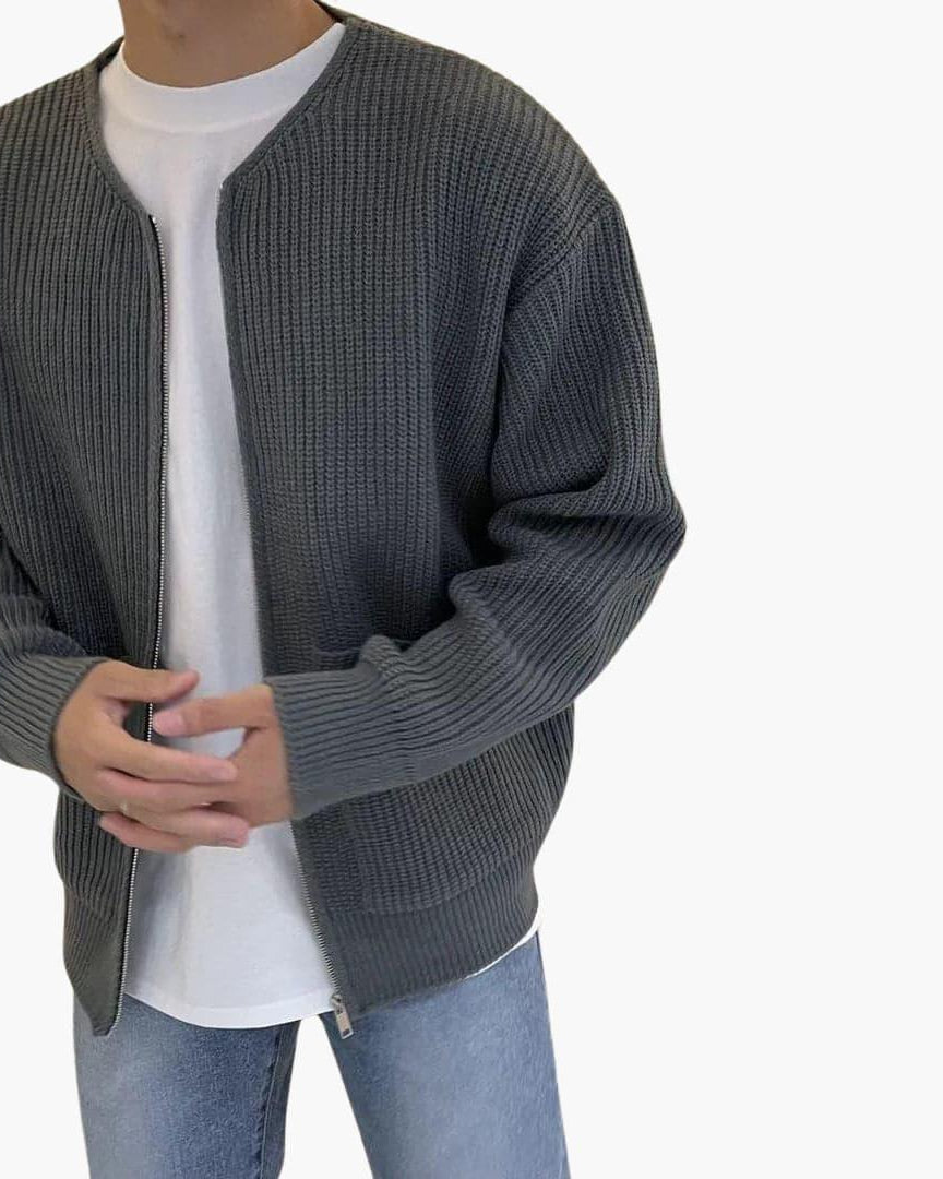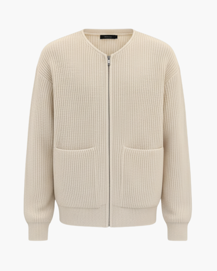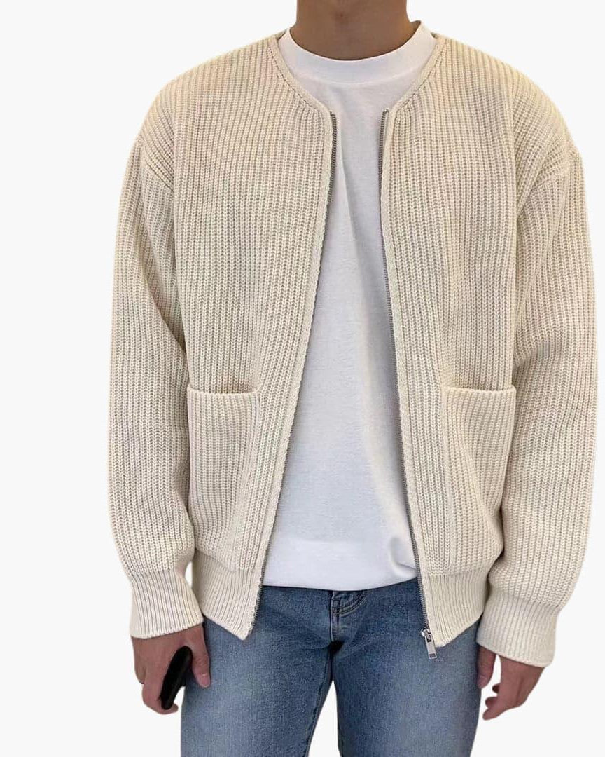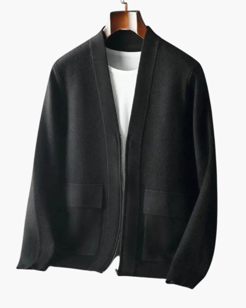 This men’s cardigan features an open-front design with a minimal button closure along the edge. The long sleeves include ribbed cuffs for a secure fit, while visible stitch lines define the silhouette. The outer layer presents a fine woven texture that provides a balanced layer ideal for transitional seasons.