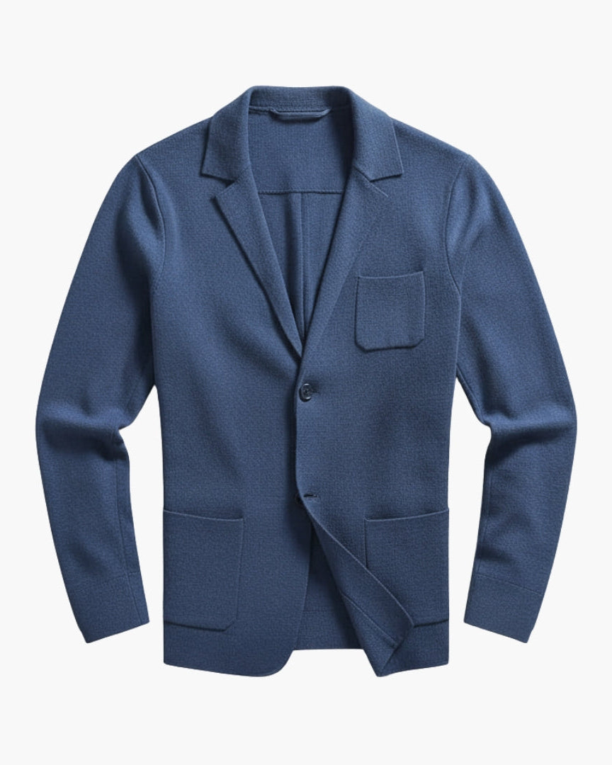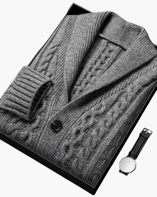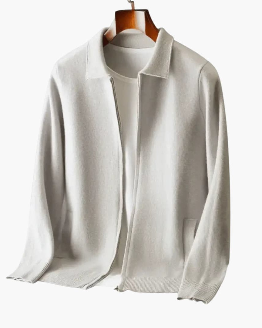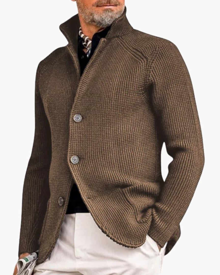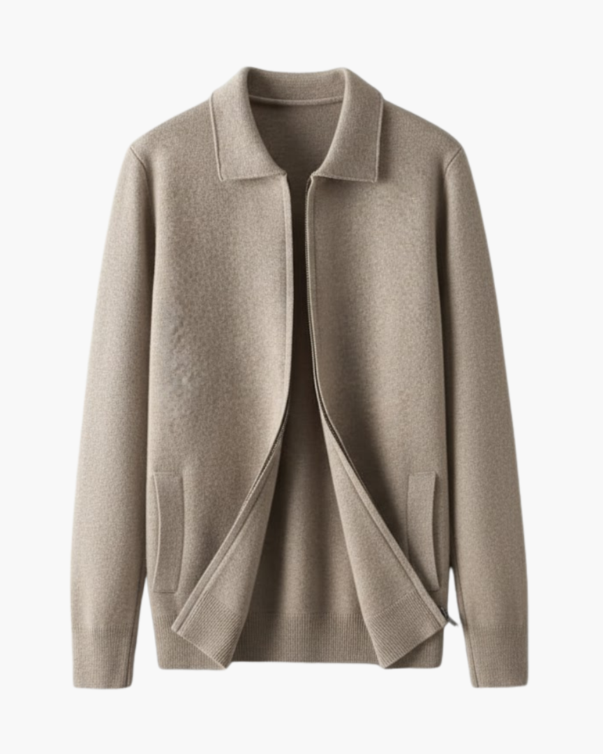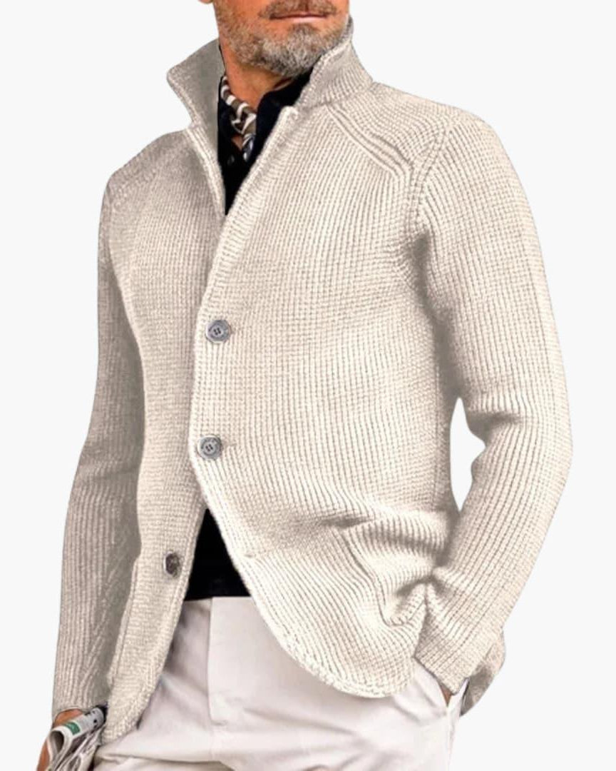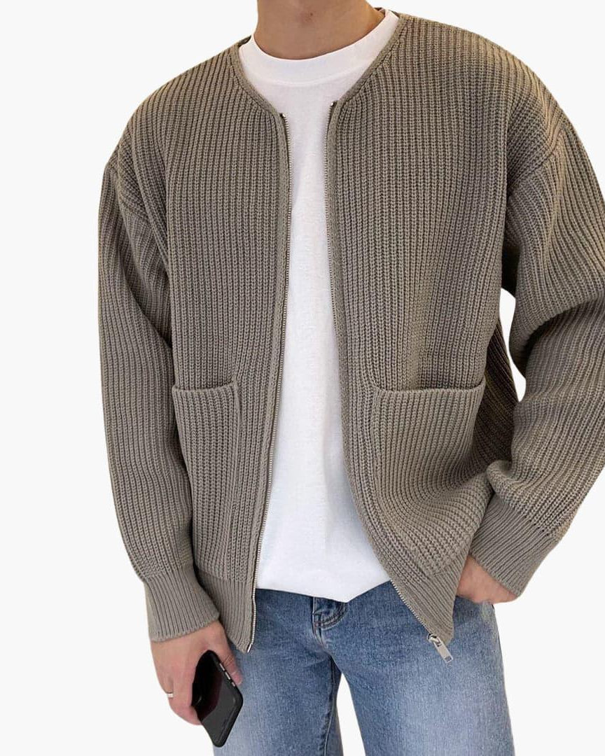 This men’s cardigan features an open-front design with a minimal button closure along the edge. The long sleeves include ribbed cuffs for a secure fit, while visible stitch lines define the silhouette. The outer layer presents a fine woven texture that provides a balanced layer ideal for transitional seasons.