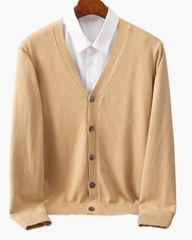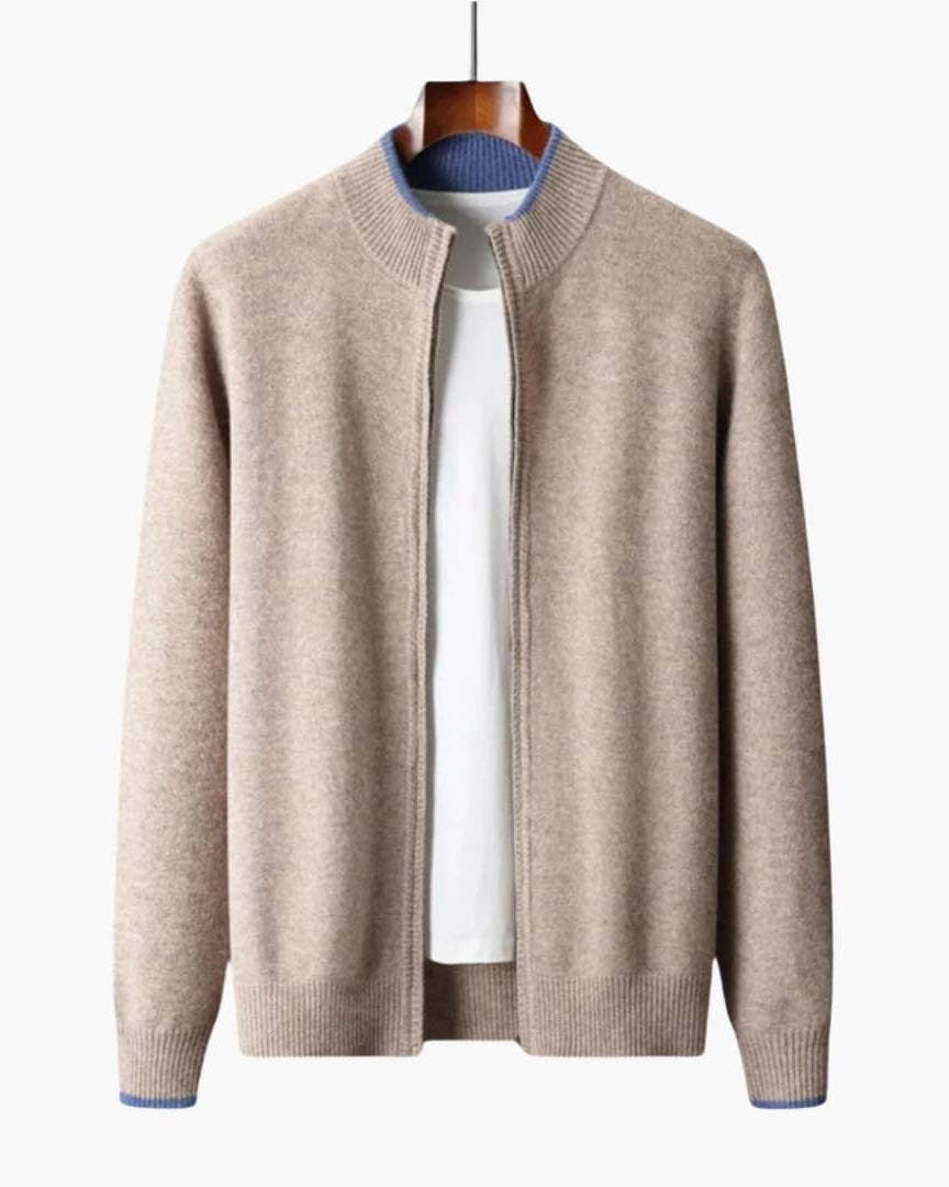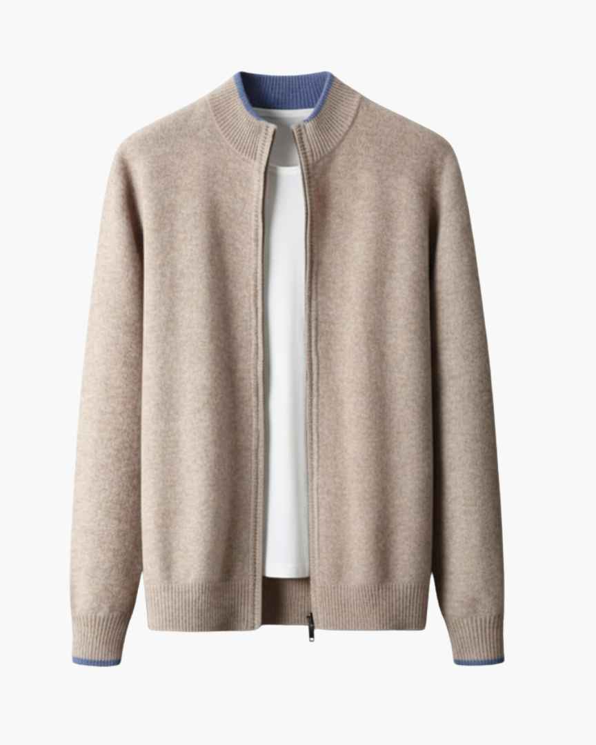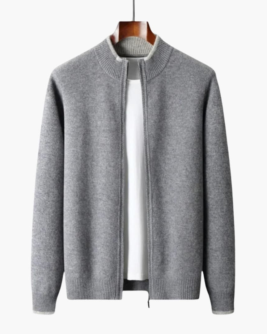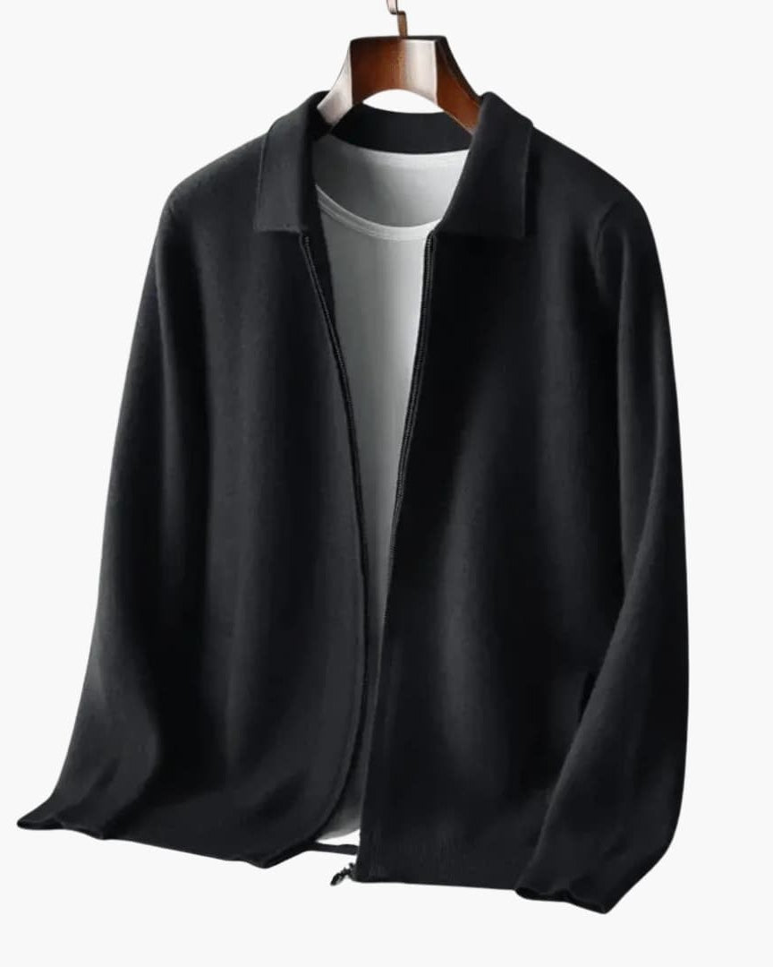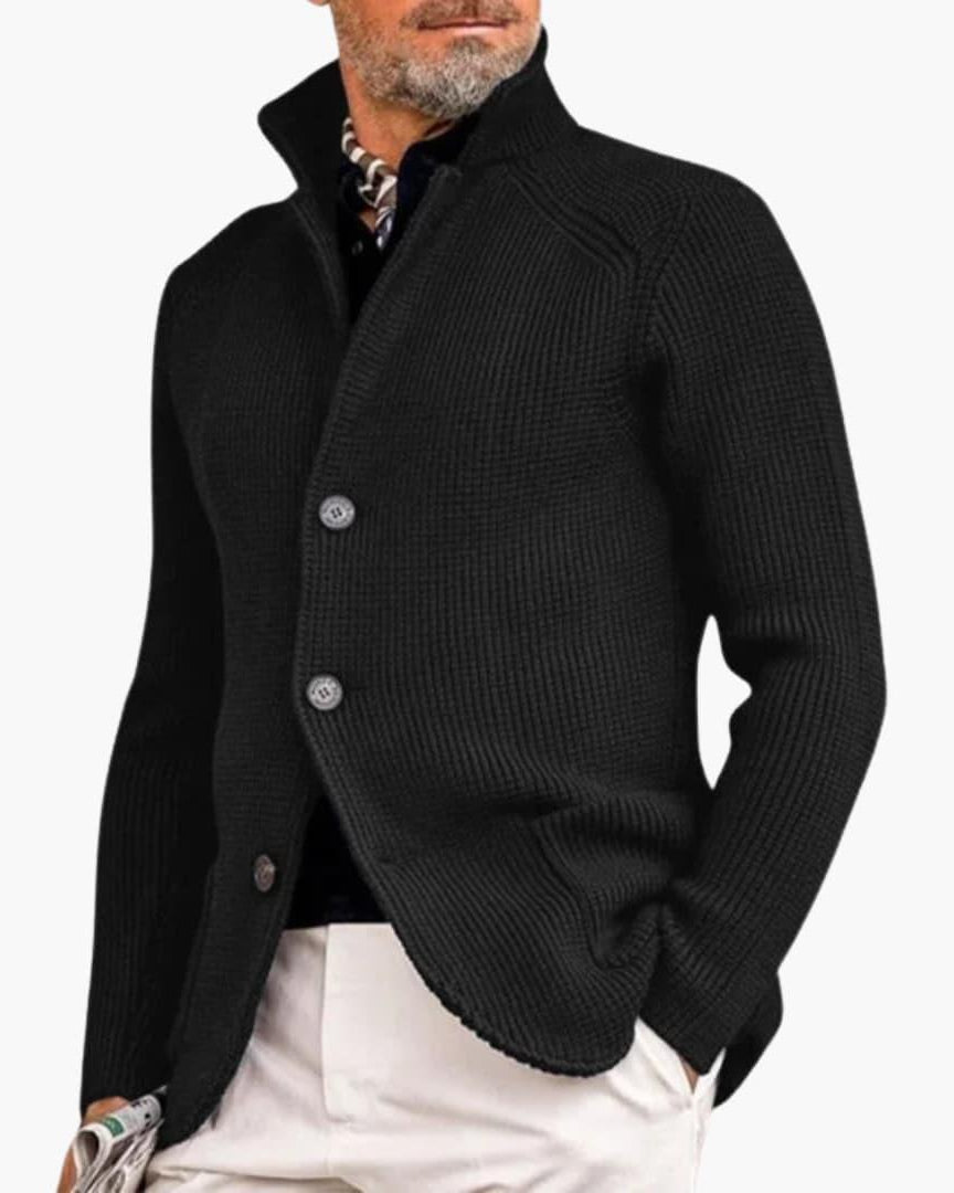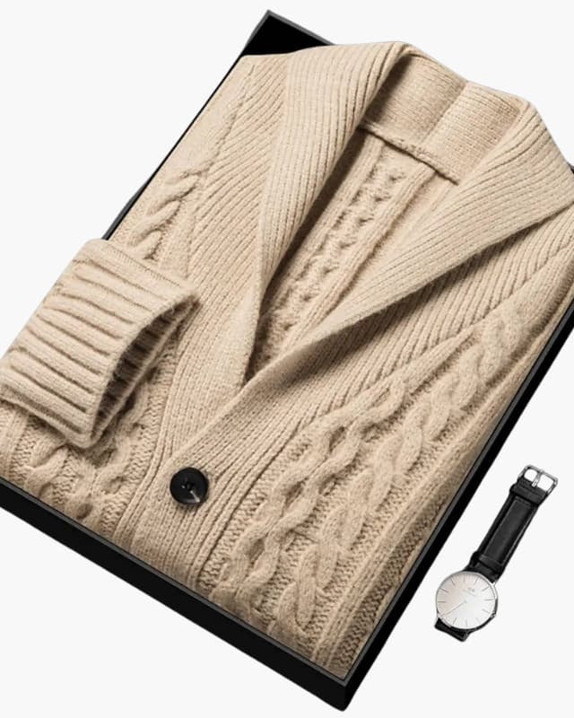 This men’s cardigan features an open-front design with a minimal button closure along the edge. The long sleeves include ribbed cuffs for a secure fit, while visible stitch lines define the silhouette. The outer layer presents a fine woven texture that provides a balanced layer ideal for transitional seasons.