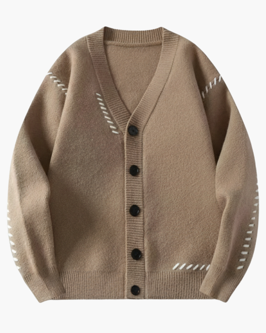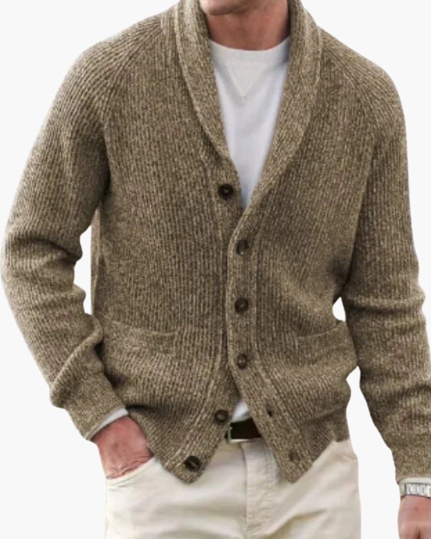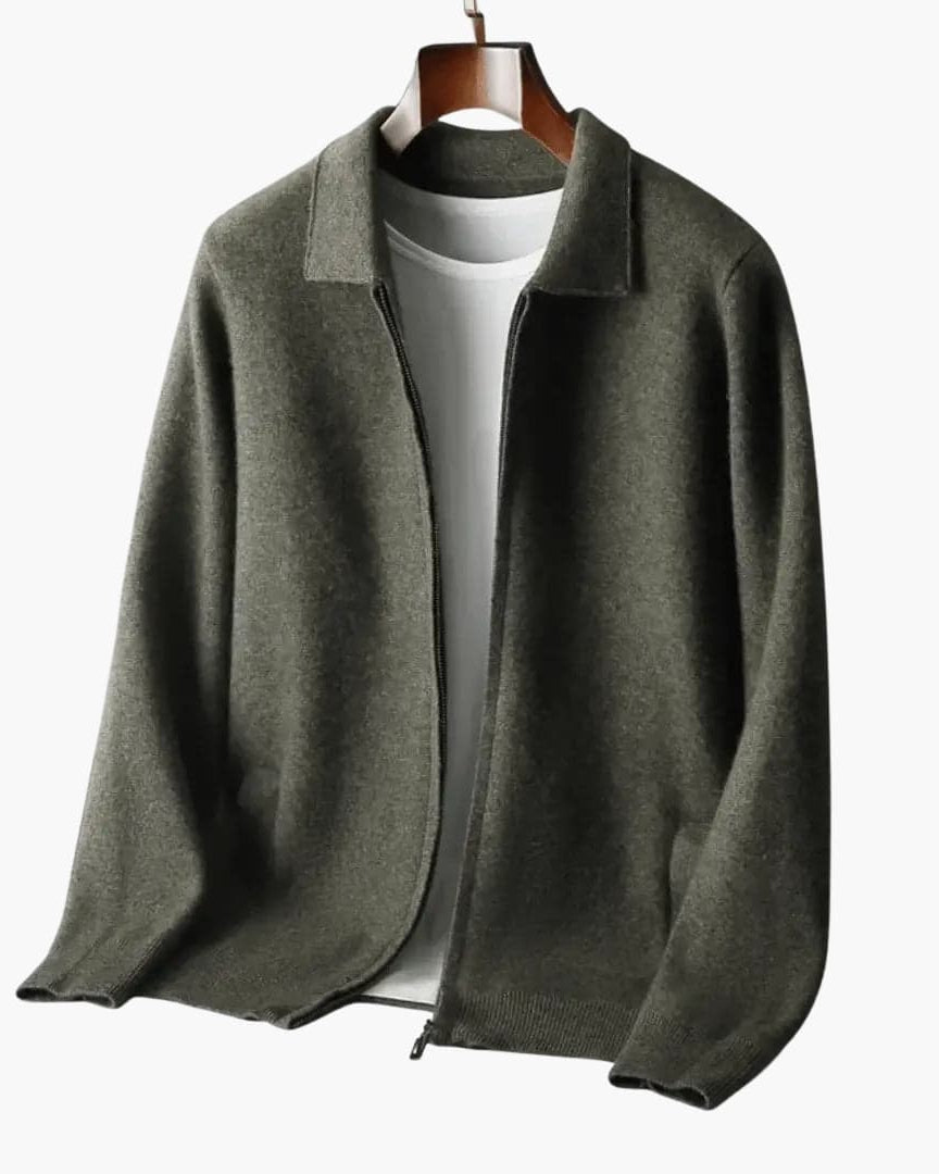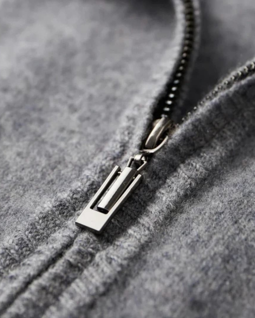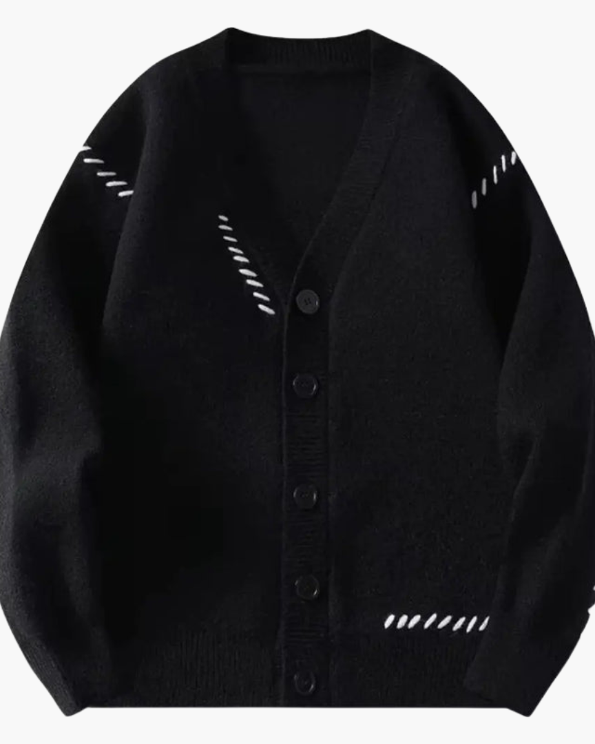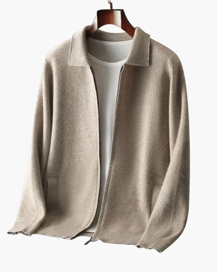 This men’s cardigan features an open-front design with a minimal button closure along the edge. The long sleeves include ribbed cuffs for a secure fit, while visible stitch lines define the silhouette. The outer layer presents a fine woven texture that provides a balanced layer ideal for transitional seasons.