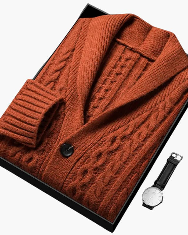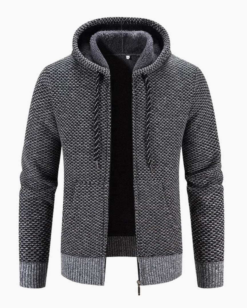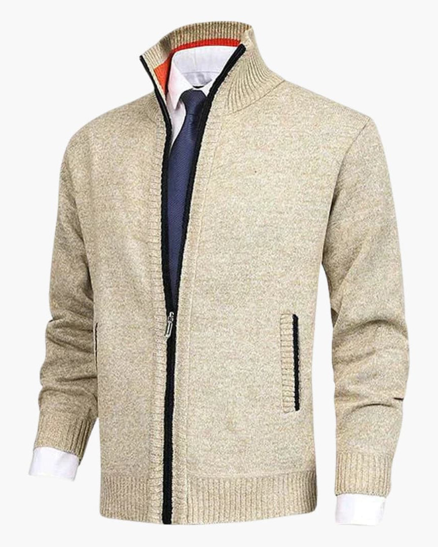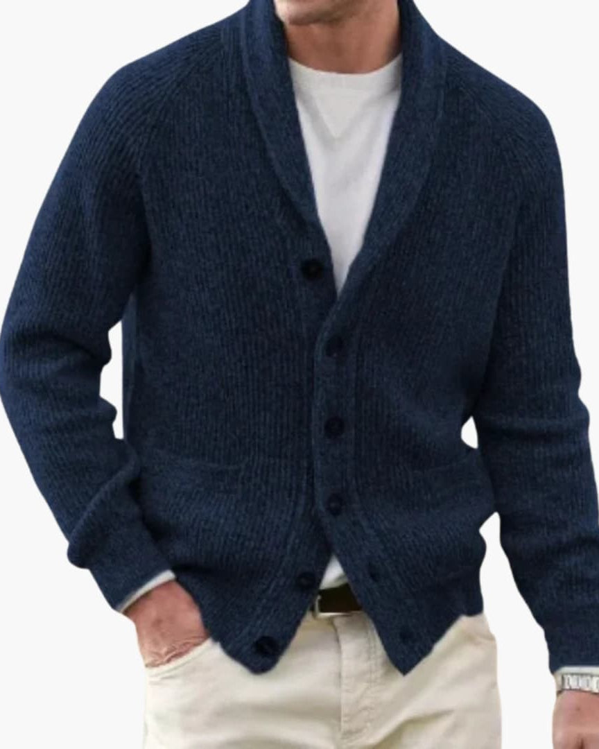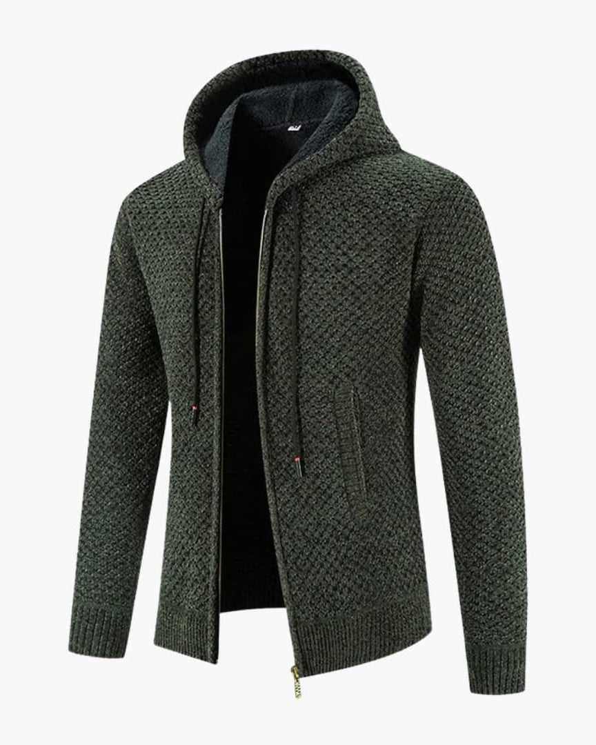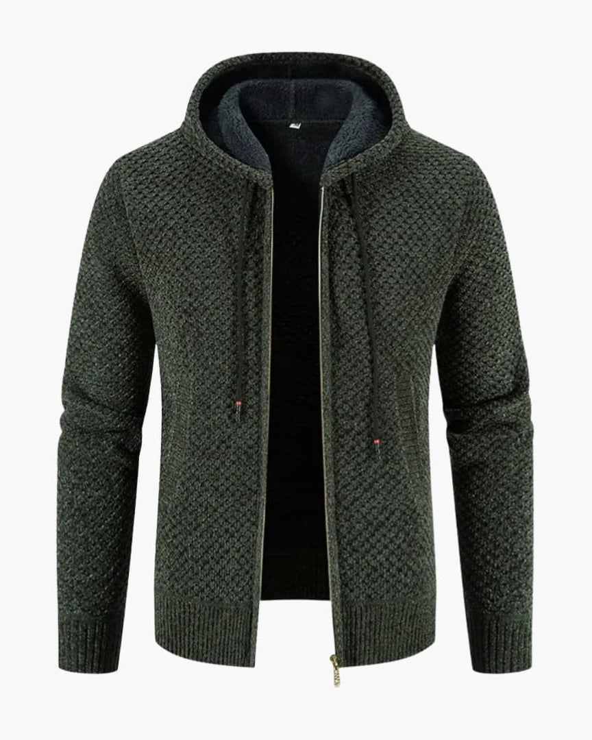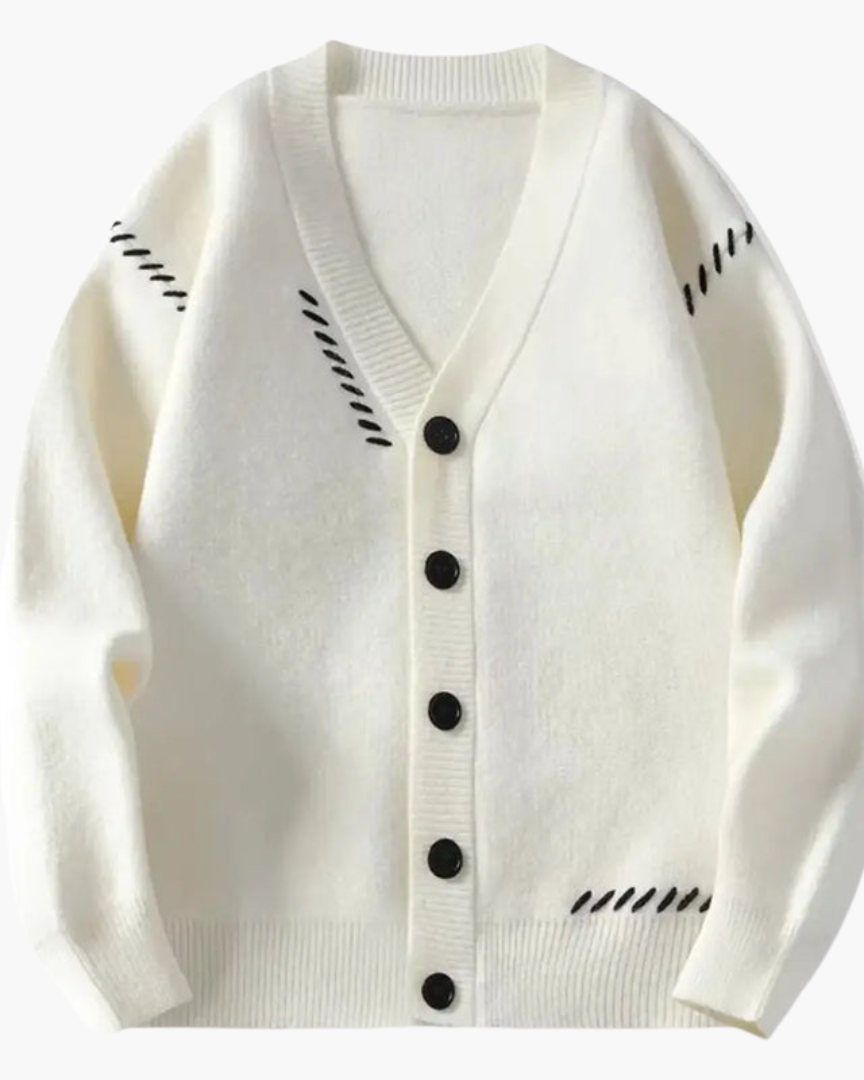 This men’s cardigan features an open-front design with a minimal button closure along the edge. The long sleeves include ribbed cuffs for a secure fit, while visible stitch lines define the silhouette. The outer layer presents a fine woven texture that provides a balanced layer ideal for transitional seasons.