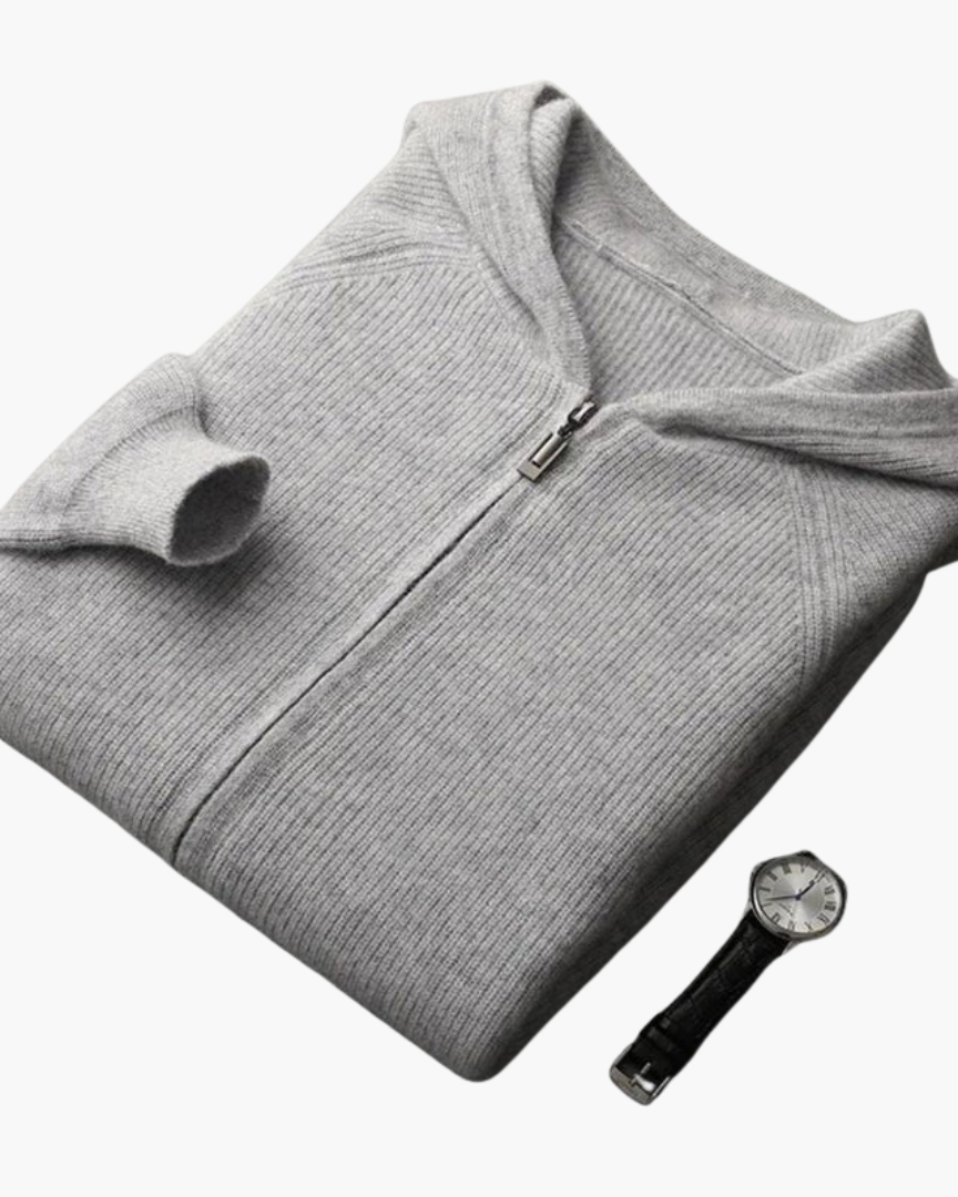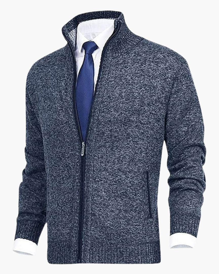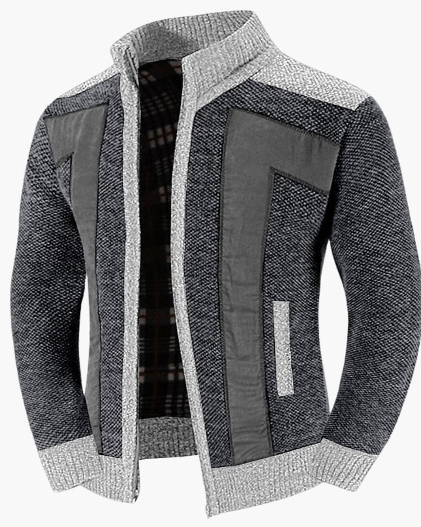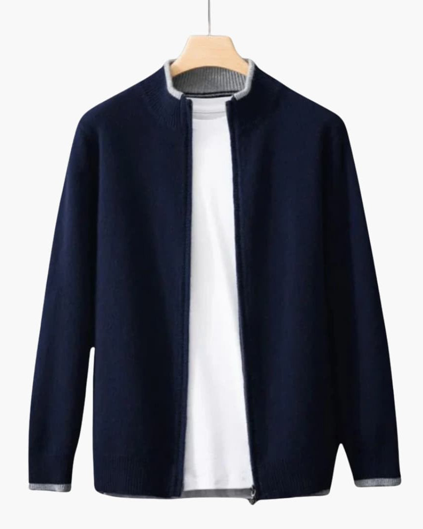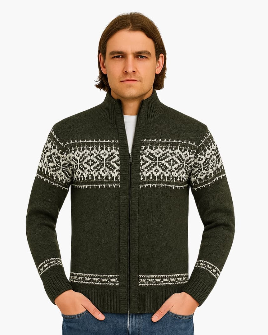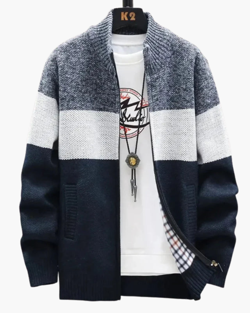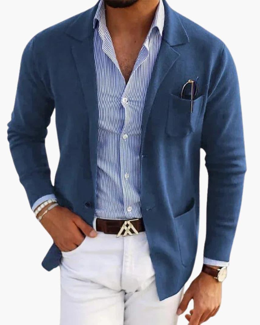 This men’s cardigan features an open-front design with a minimal button closure along the edge. The long sleeves include ribbed cuffs for a secure fit, while visible stitch lines define the silhouette. The outer layer presents a fine woven texture that provides a balanced layer ideal for transitional seasons.