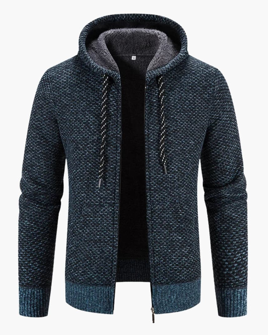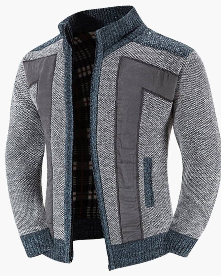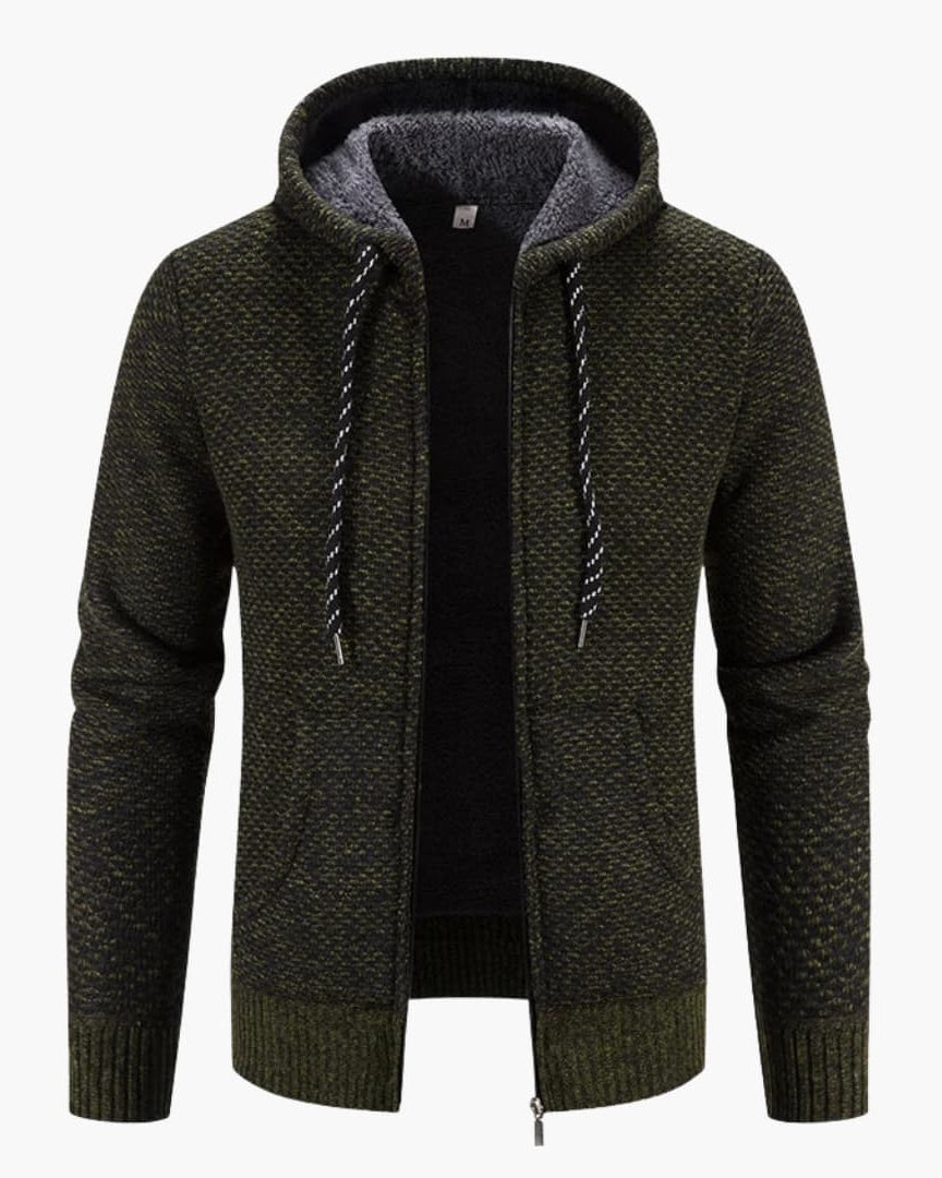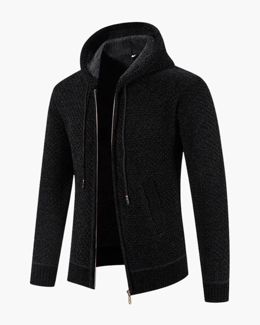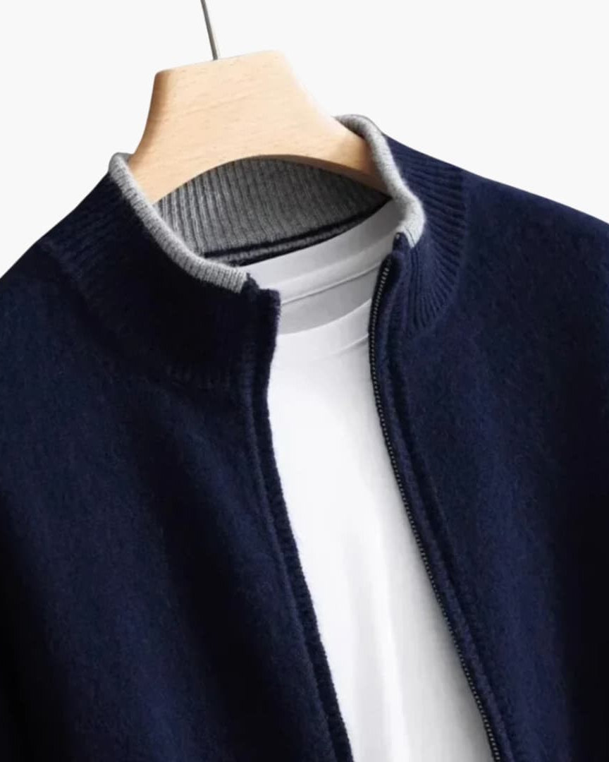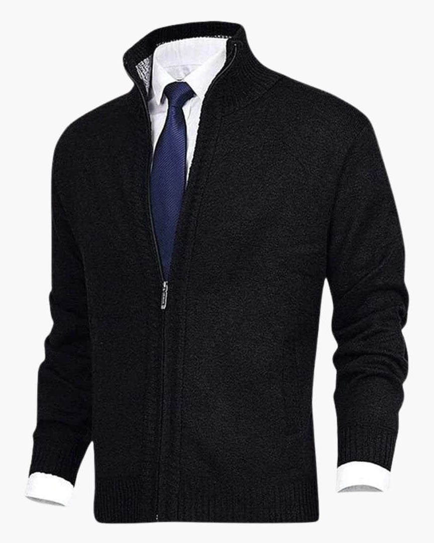 This men’s cardigan features an open-front design with a minimal button closure along the edge. The long sleeves include ribbed cuffs for a secure fit, while visible stitch lines define the silhouette. The outer layer presents a fine woven texture that provides a balanced layer ideal for transitional seasons.