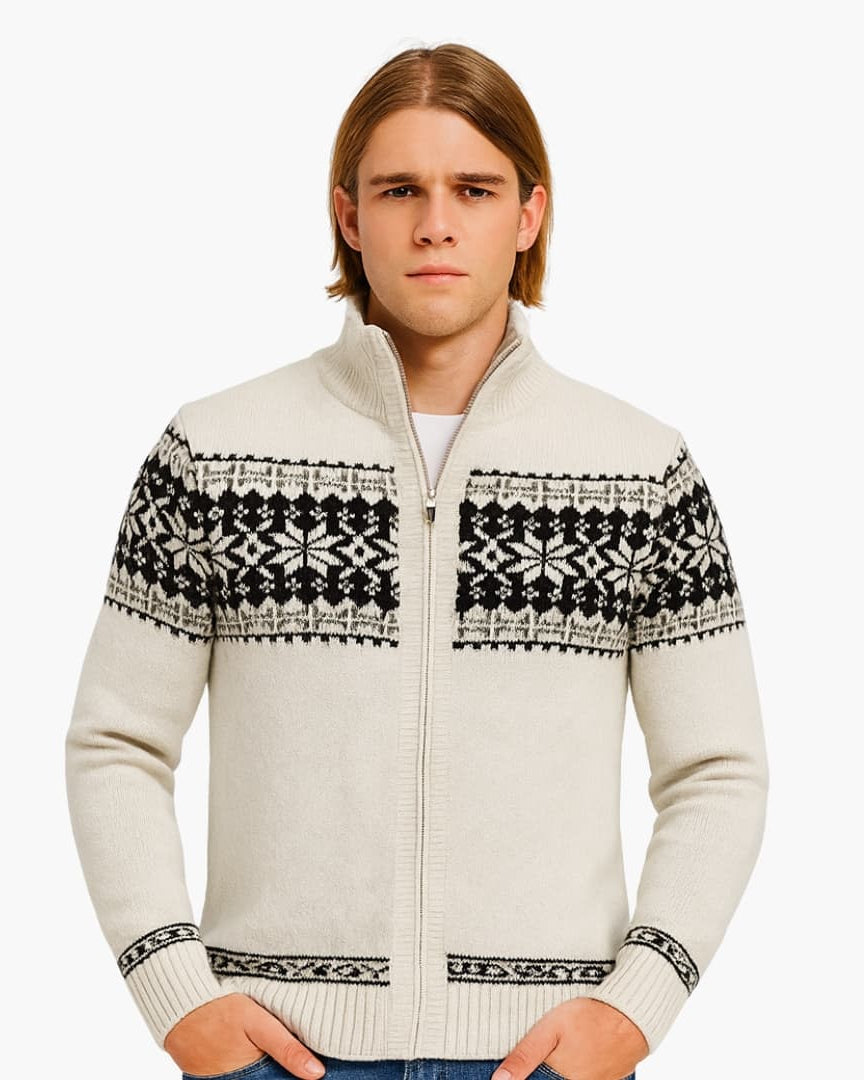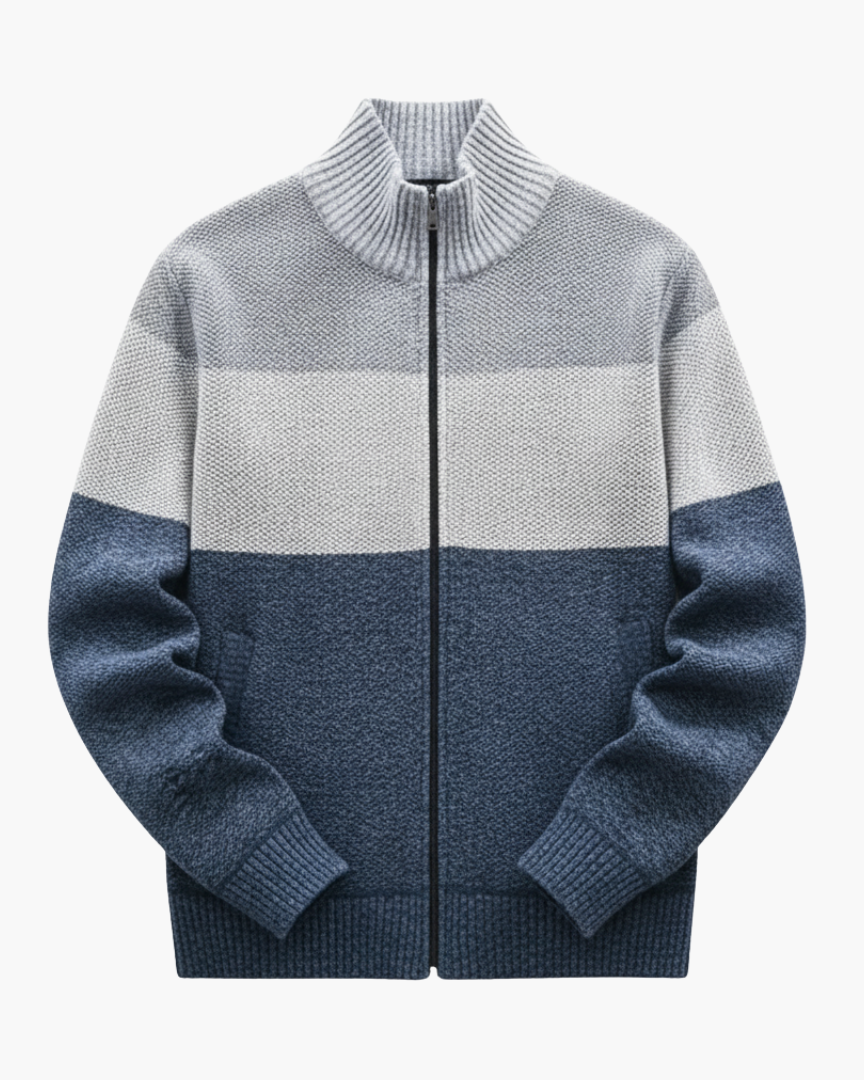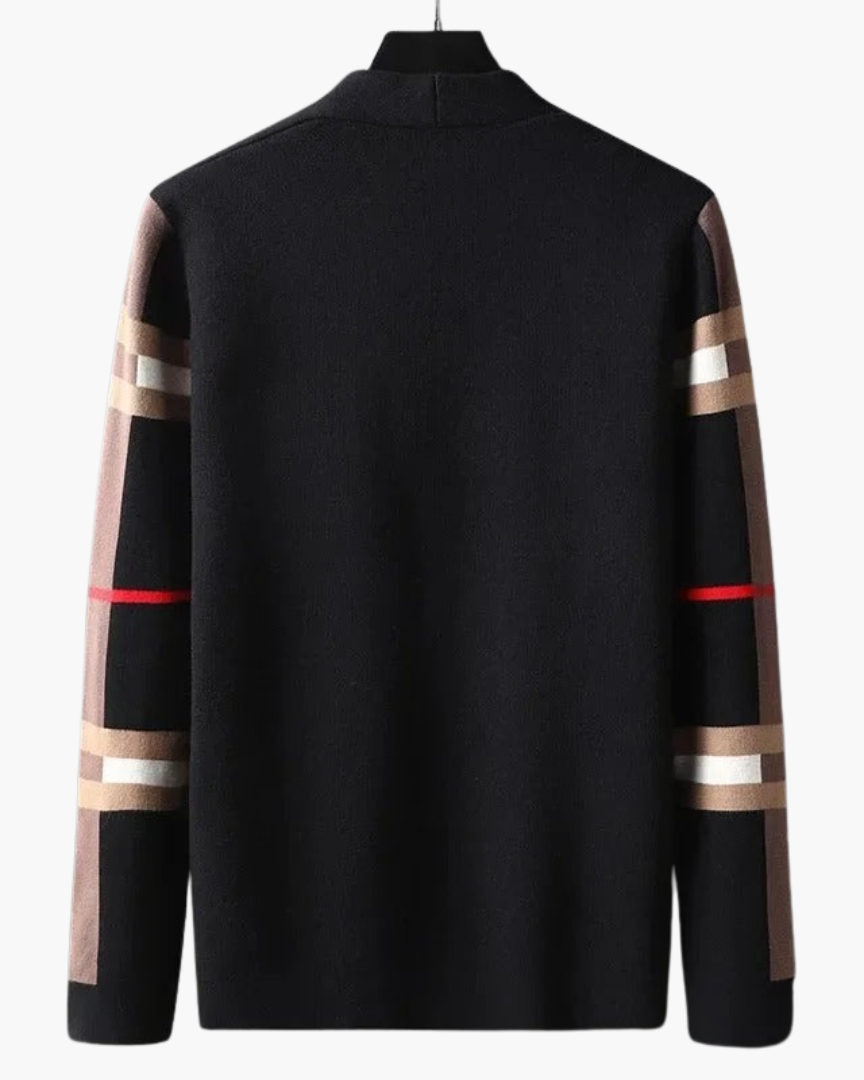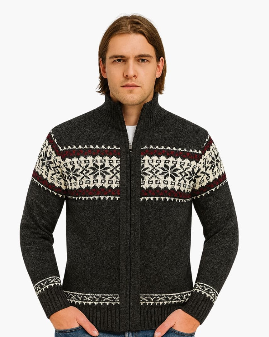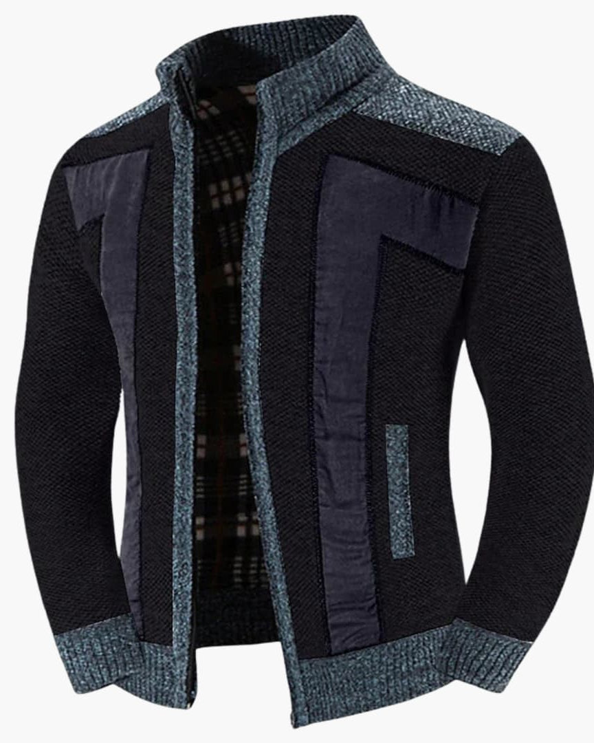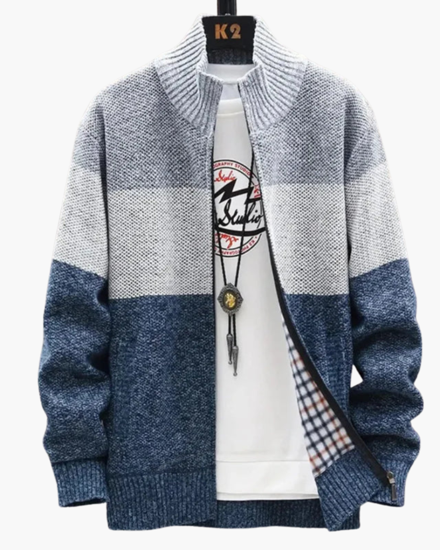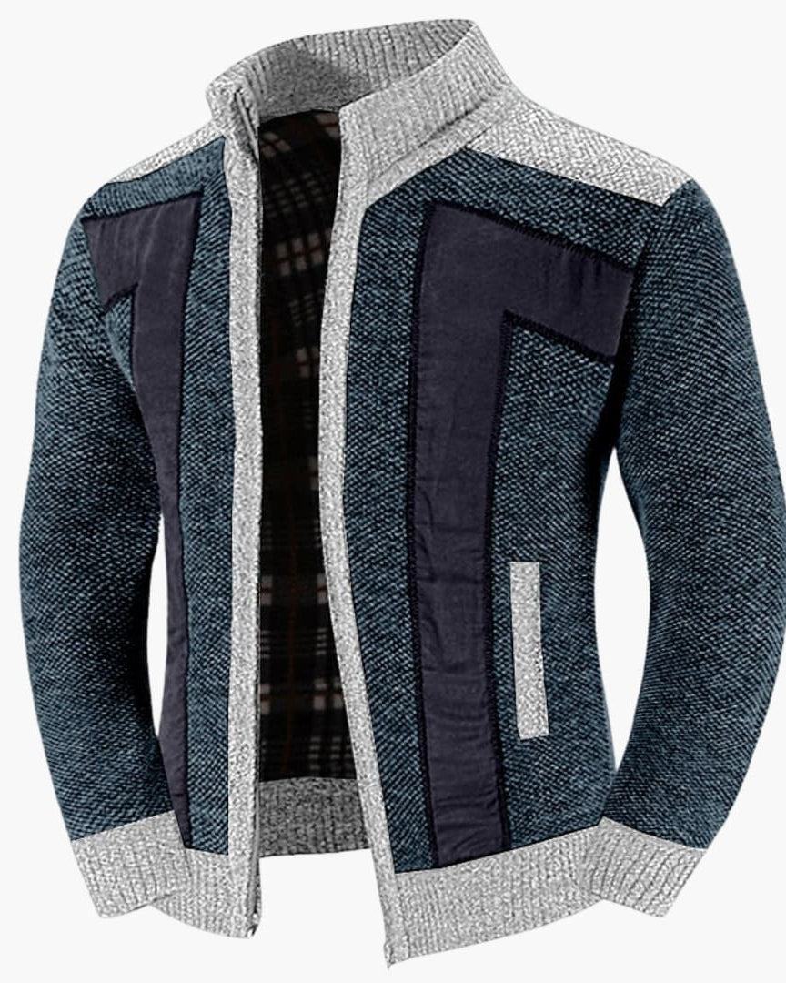 This men’s cardigan features an open-front design with a minimal button closure along the edge. The long sleeves include ribbed cuffs for a secure fit, while visible stitch lines define the silhouette. The outer layer presents a fine woven texture that provides a balanced layer ideal for transitional seasons.
