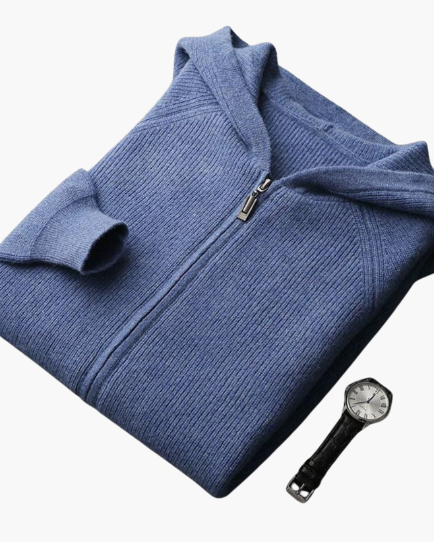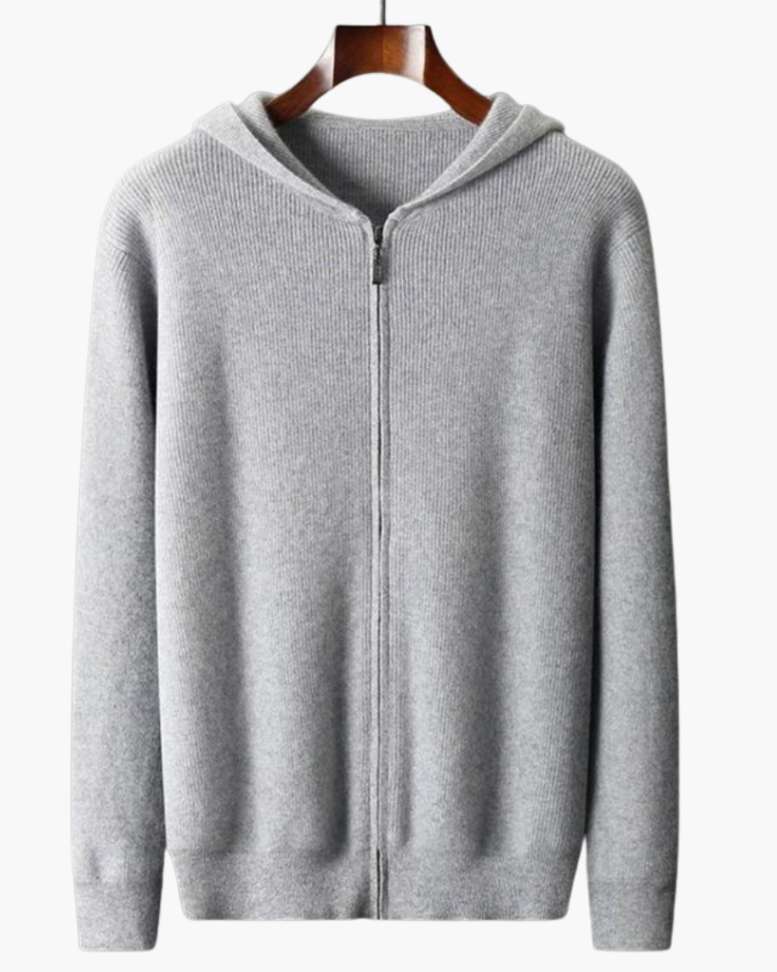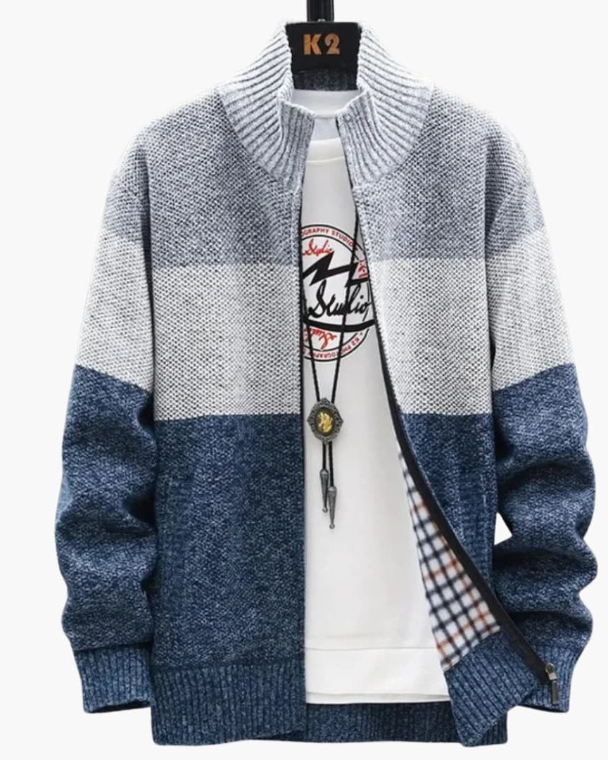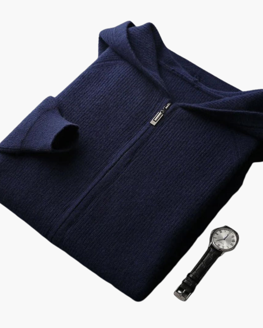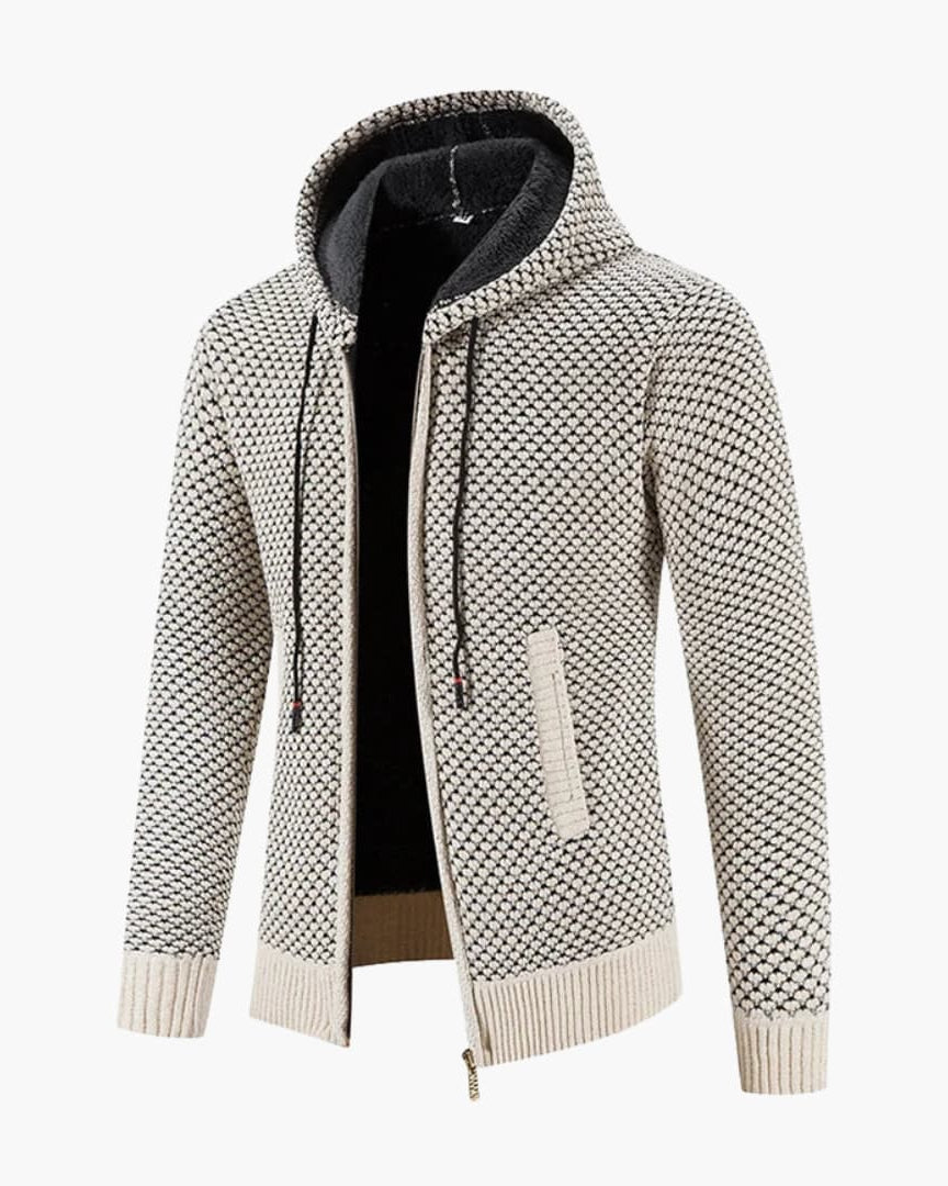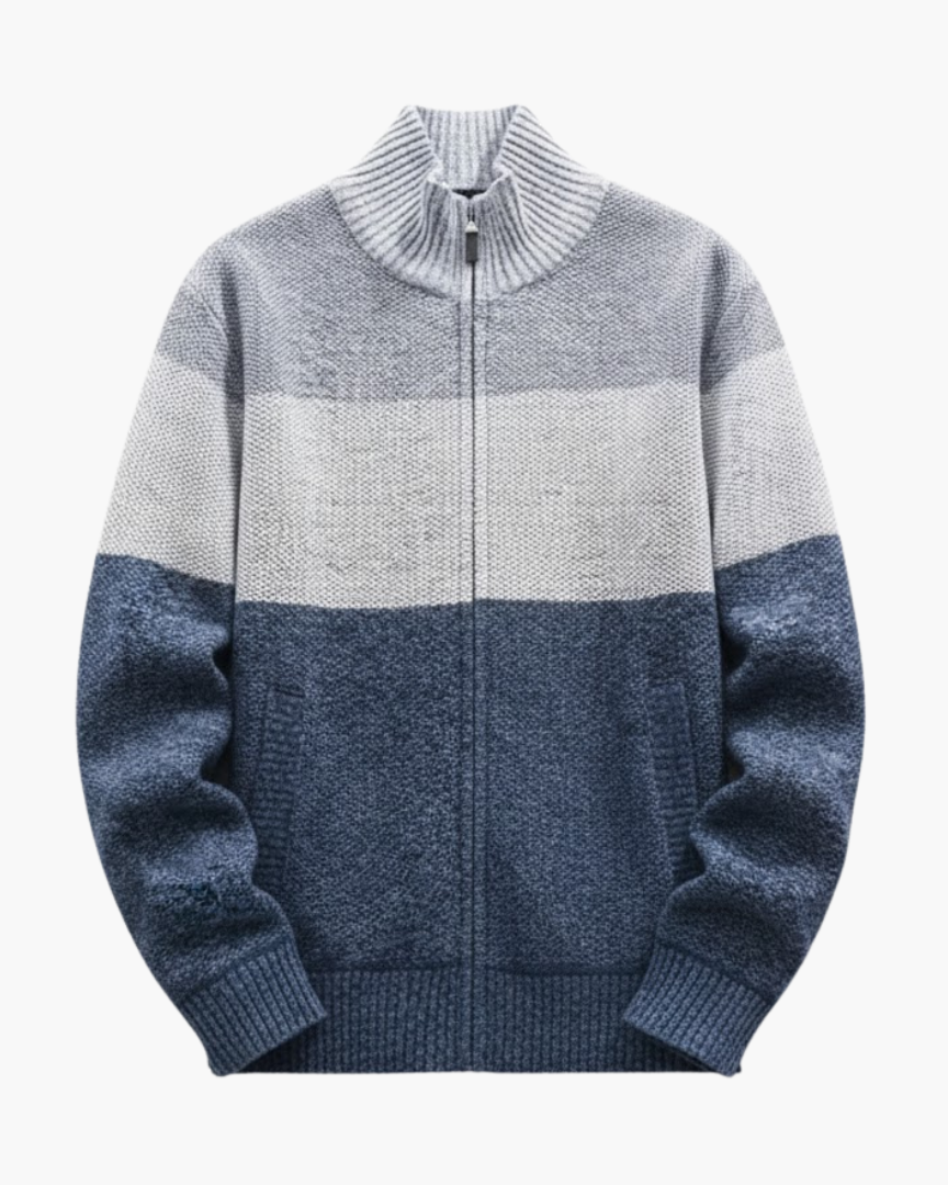 This men’s cardigan features an open-front design with a minimal button closure along the edge. The long sleeves include ribbed cuffs for a secure fit, while visible stitch lines define the silhouette. The outer layer presents a fine woven texture that provides a balanced layer ideal for transitional seasons.