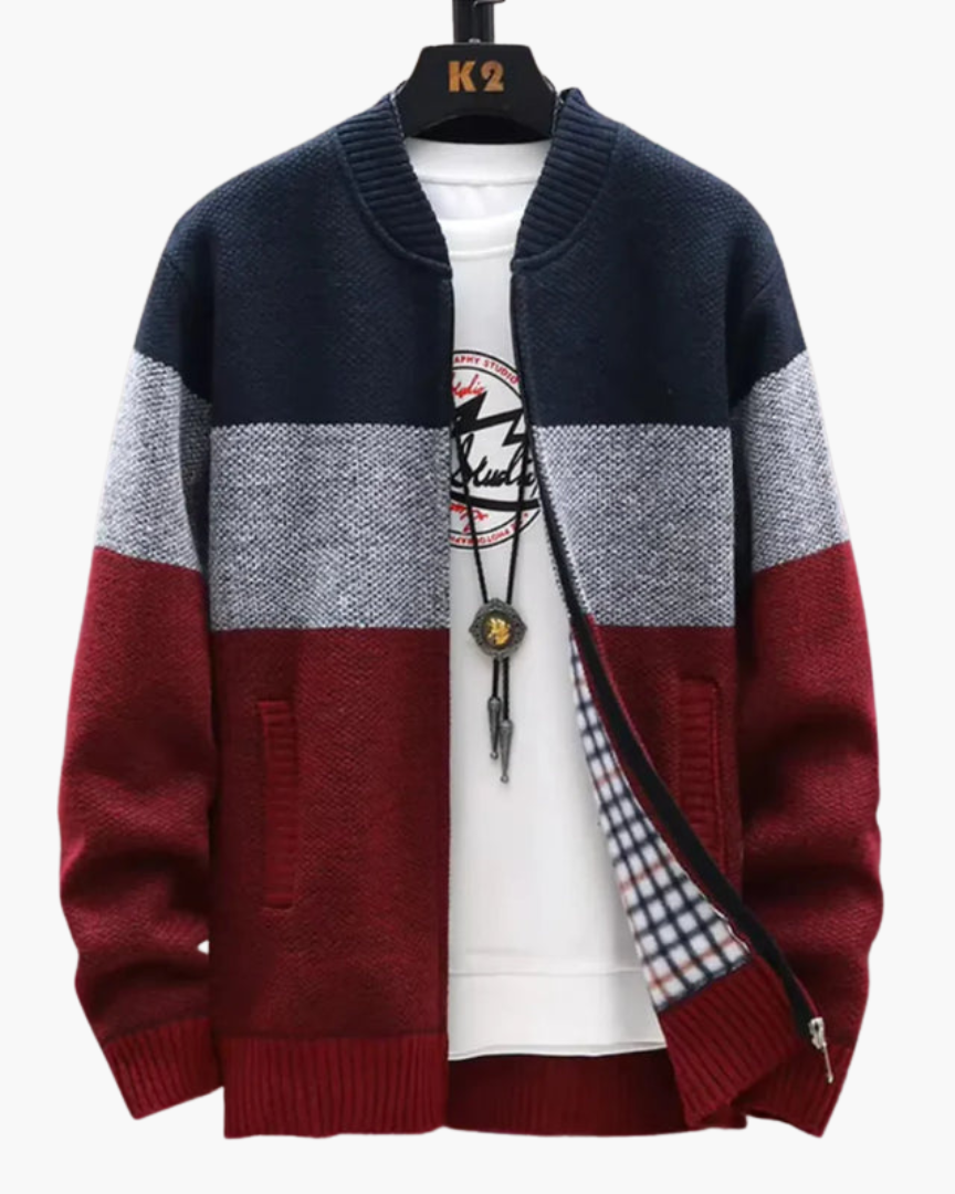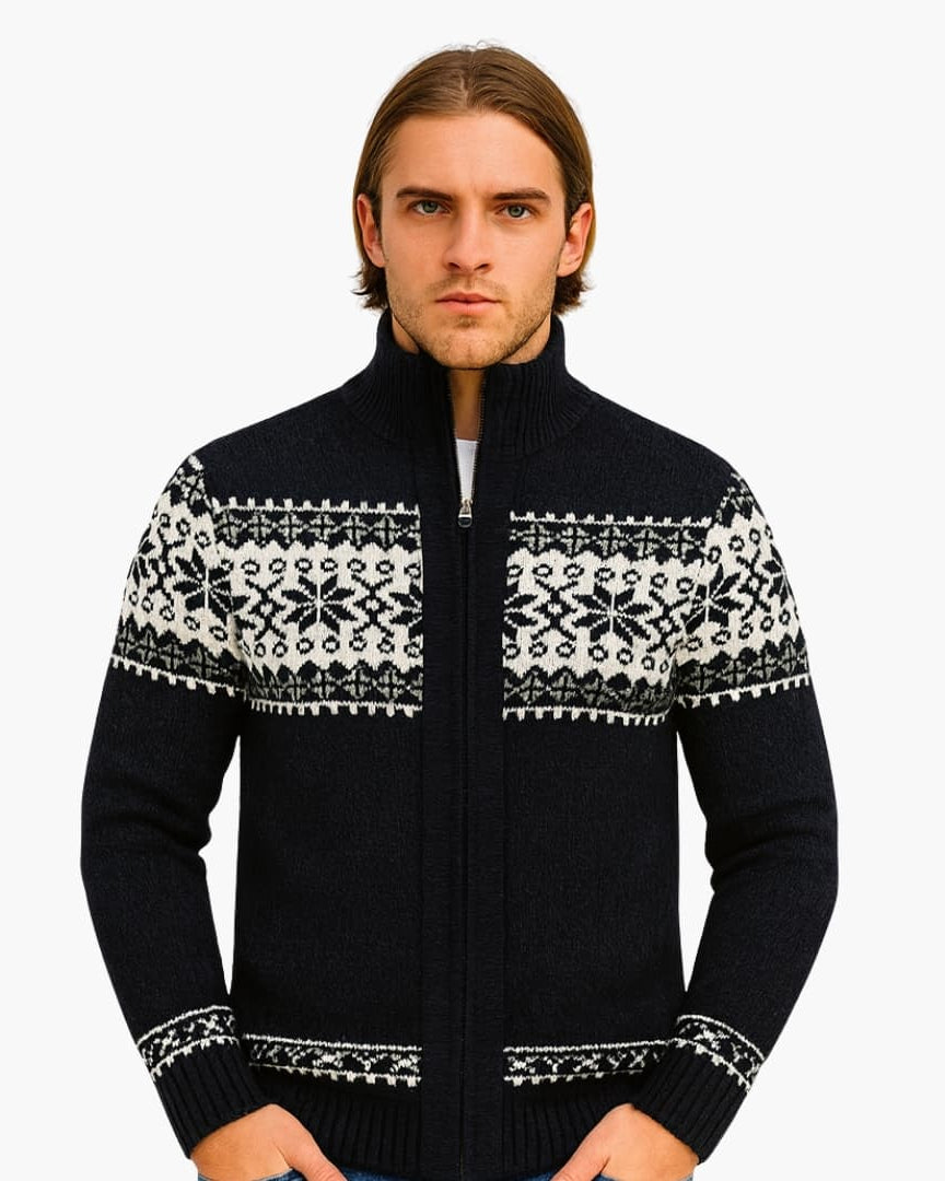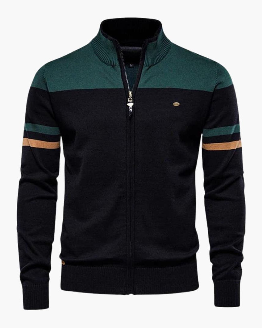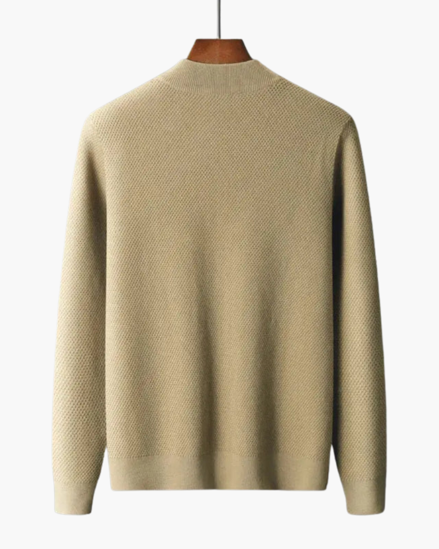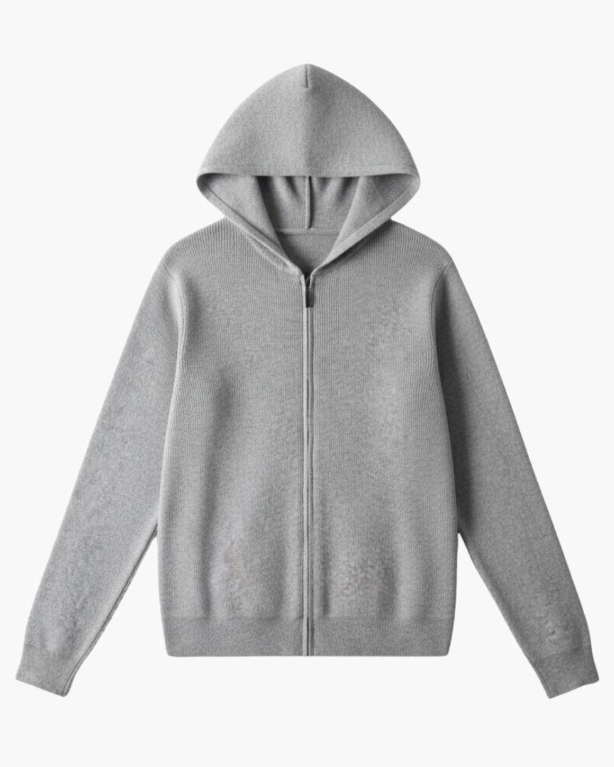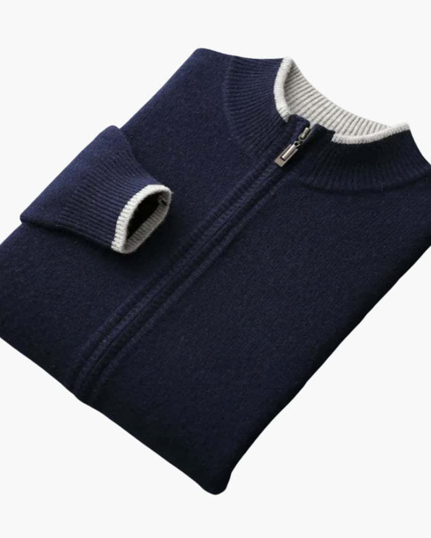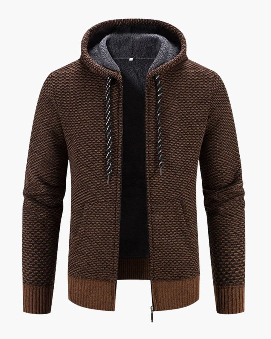 This men’s cardigan features an open-front design with a minimal button closure along the edge. The long sleeves include ribbed cuffs for a secure fit, while visible stitch lines define the silhouette. The outer layer presents a fine woven texture that provides a balanced layer ideal for transitional seasons.