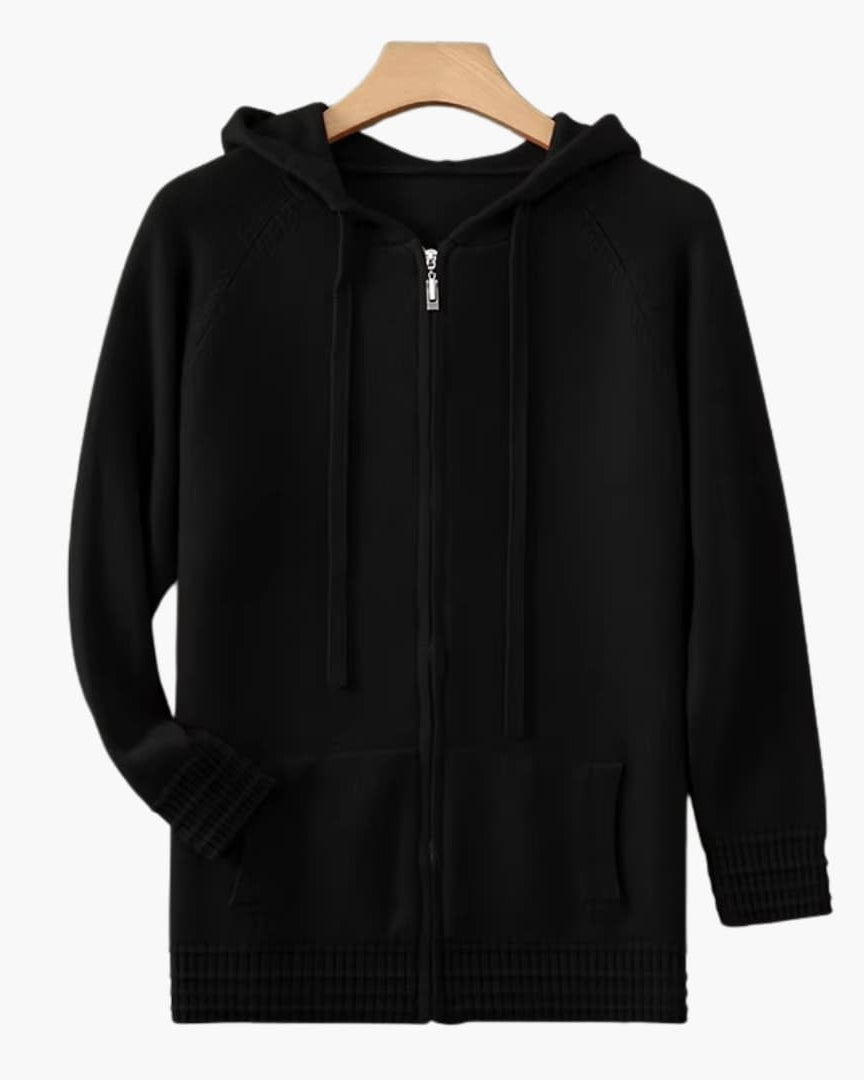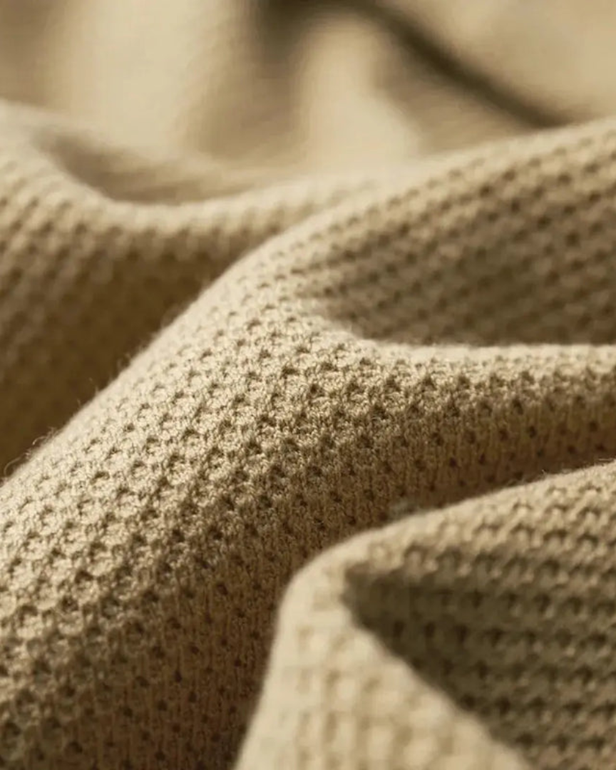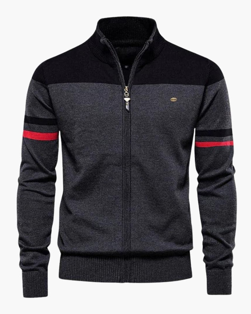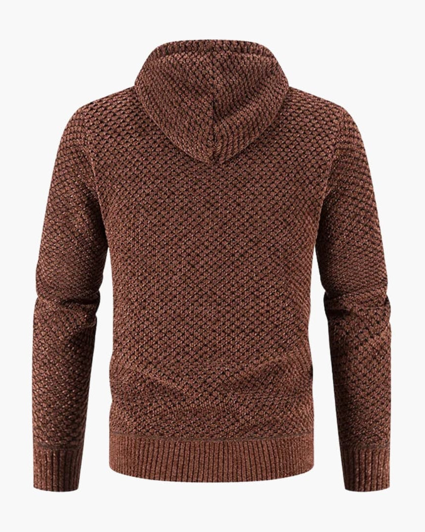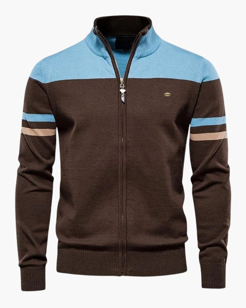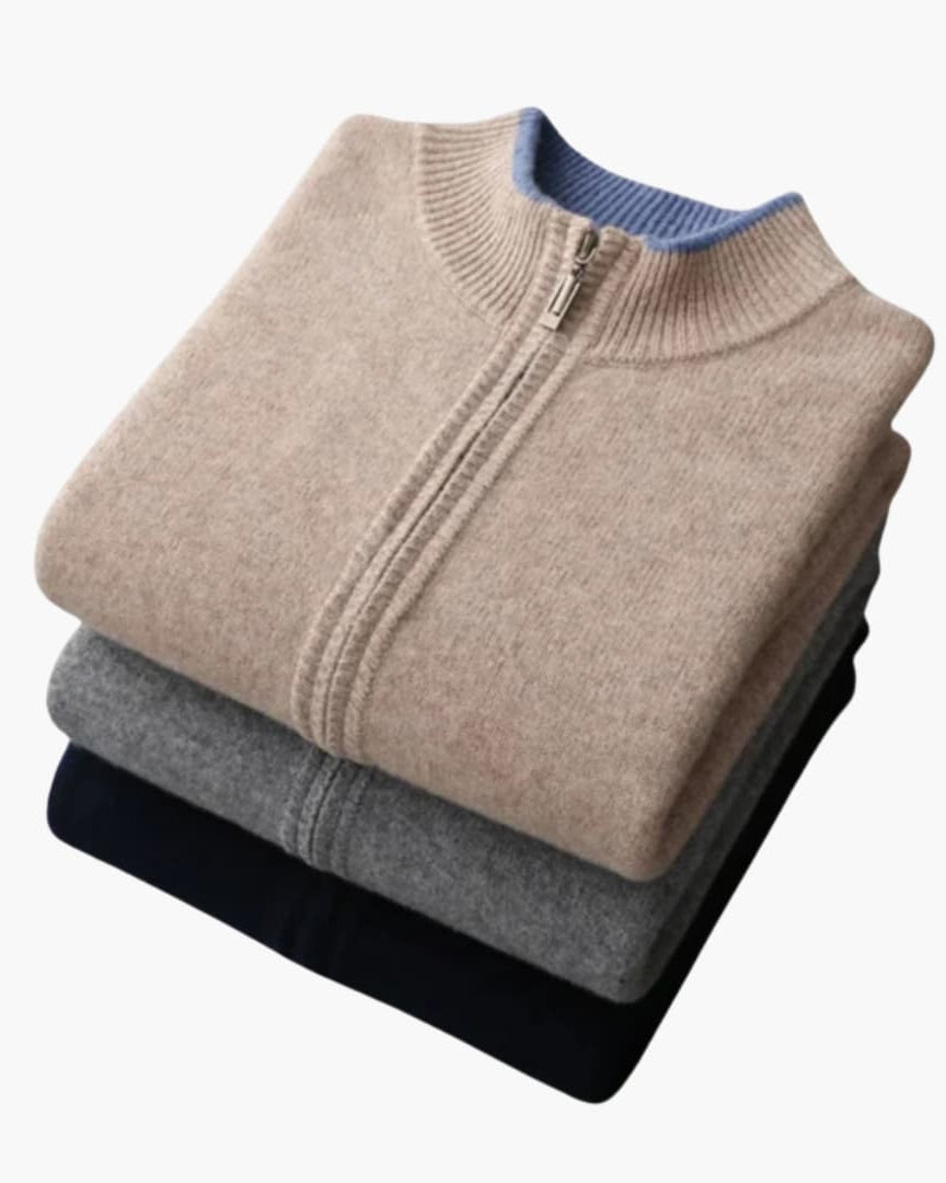 This men’s cardigan features an open-front design with a minimal button closure along the edge. The long sleeves include ribbed cuffs for a secure fit, while visible stitch lines define the silhouette. The outer layer presents a fine woven texture that provides a balanced layer ideal for transitional seasons.
