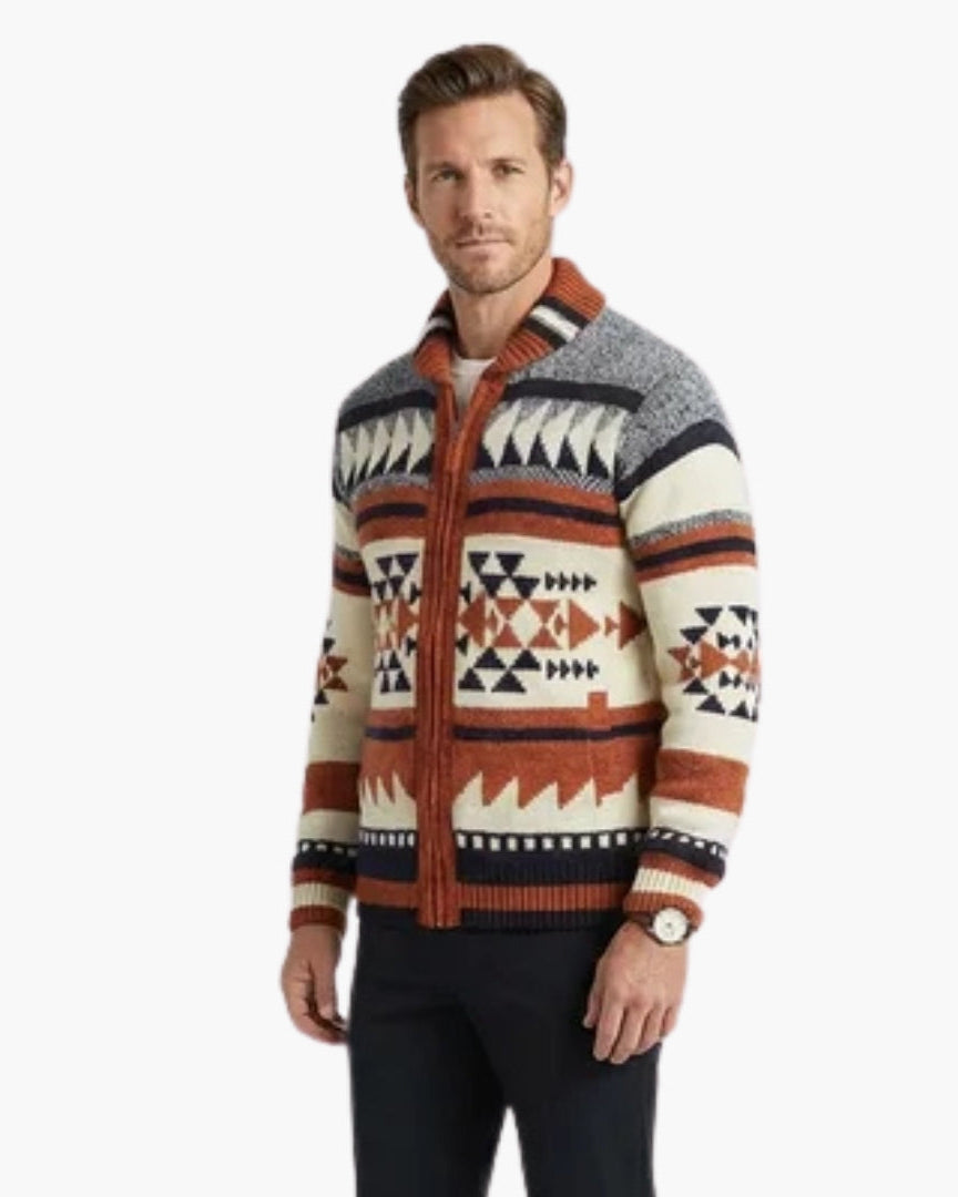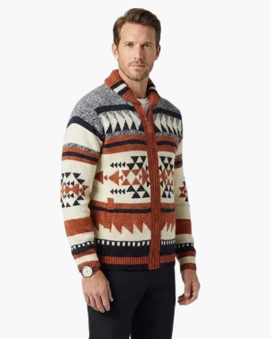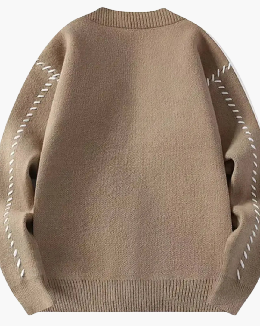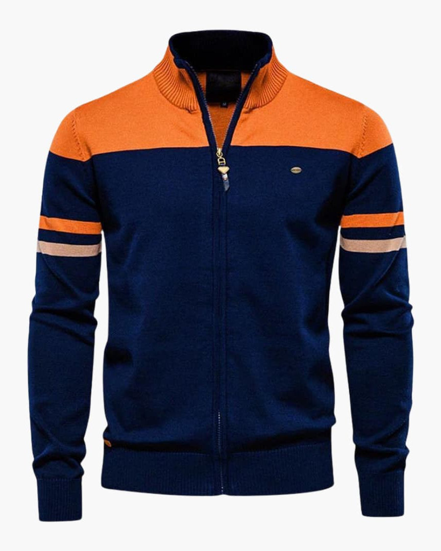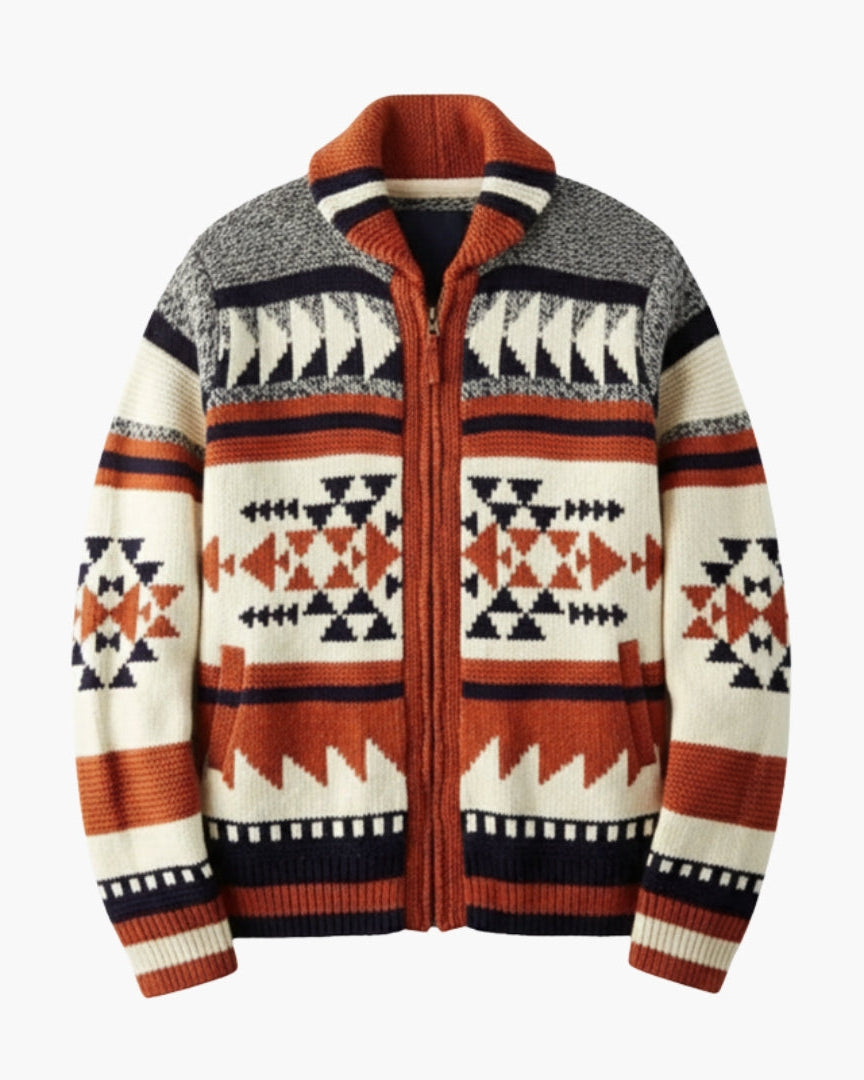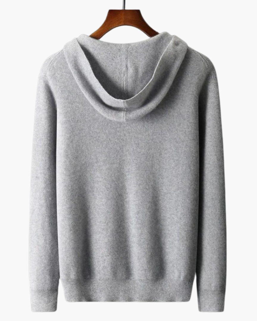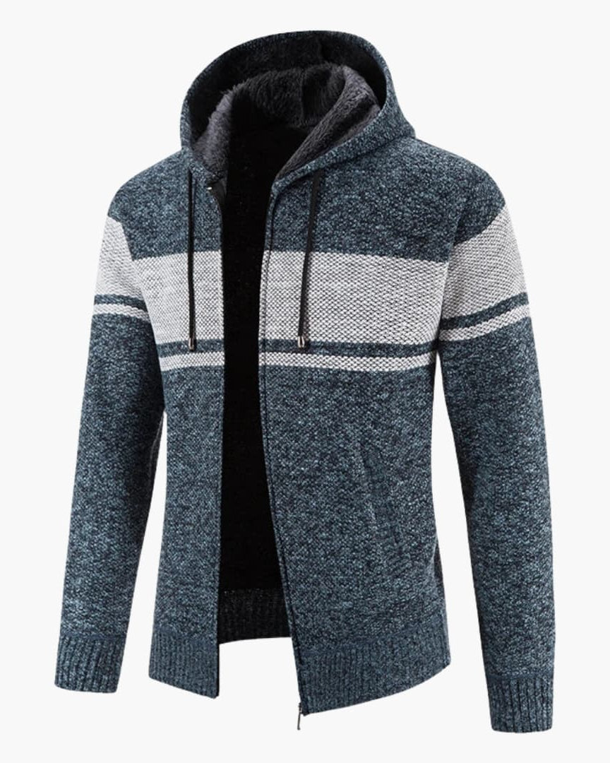 This men’s cardigan features an open-front design with a minimal button closure along the edge. The long sleeves include ribbed cuffs for a secure fit, while visible stitch lines define the silhouette. The outer layer presents a fine woven texture that provides a balanced layer ideal for transitional seasons.
