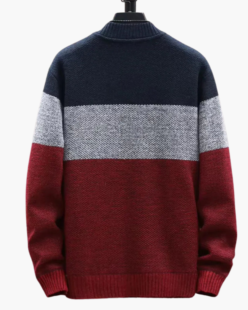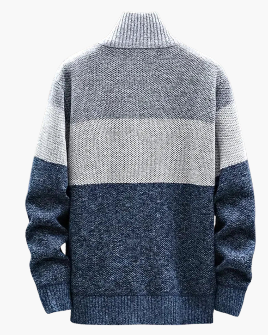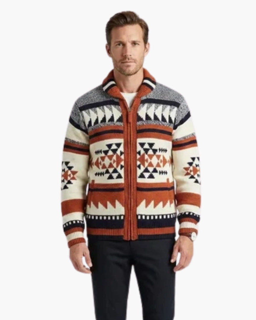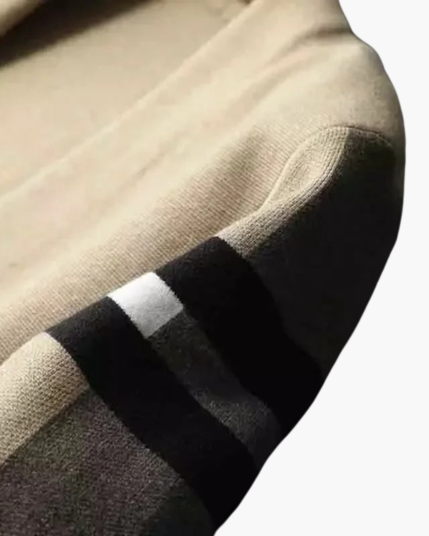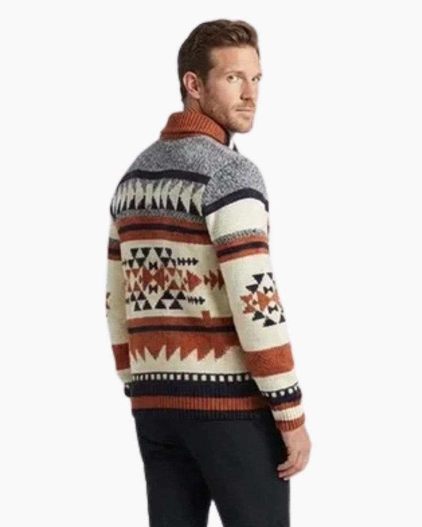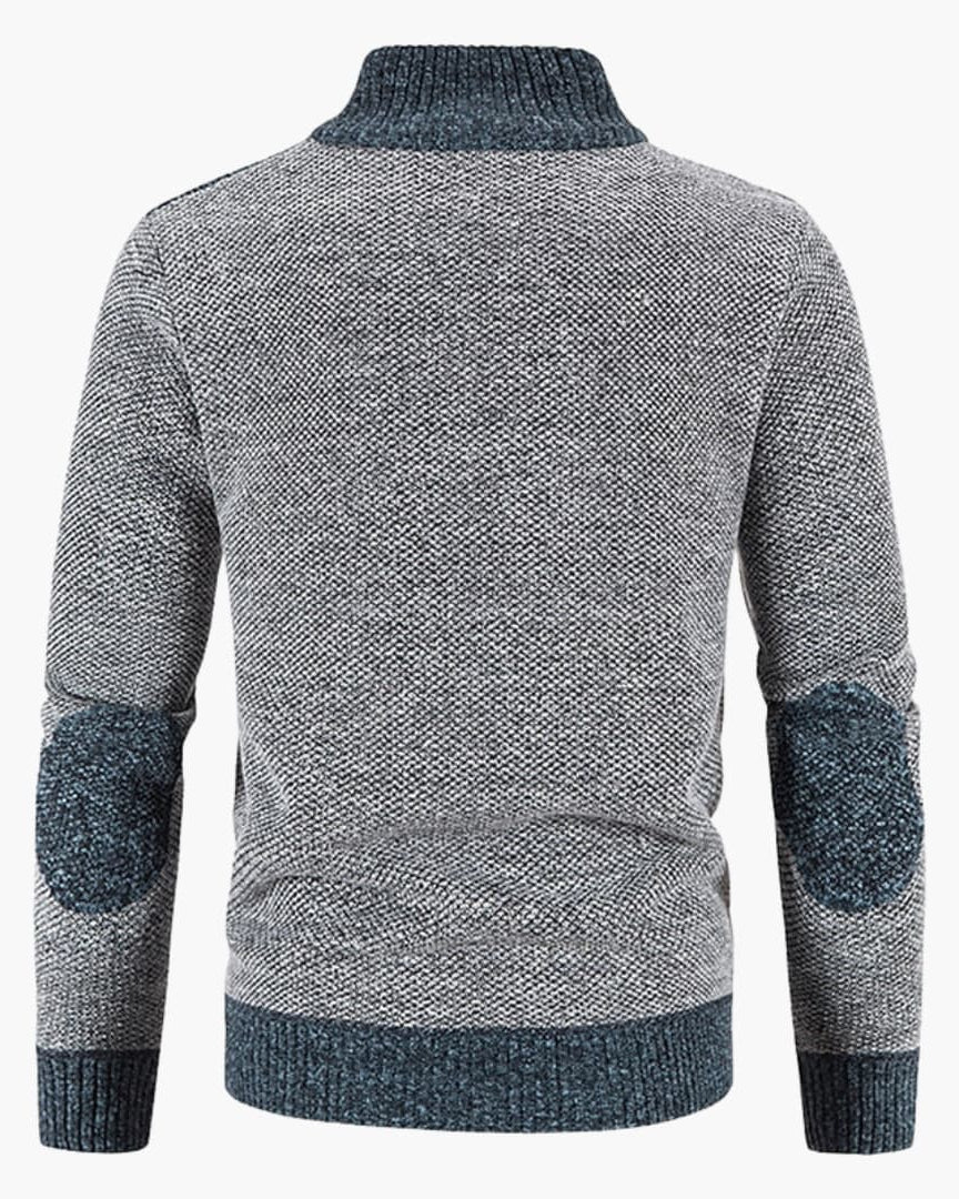 This men’s cardigan features an open-front design with a minimal button closure along the edge. The long sleeves include ribbed cuffs for a secure fit, while visible stitch lines define the silhouette. The outer layer presents a fine woven texture that provides a balanced layer ideal for transitional seasons.